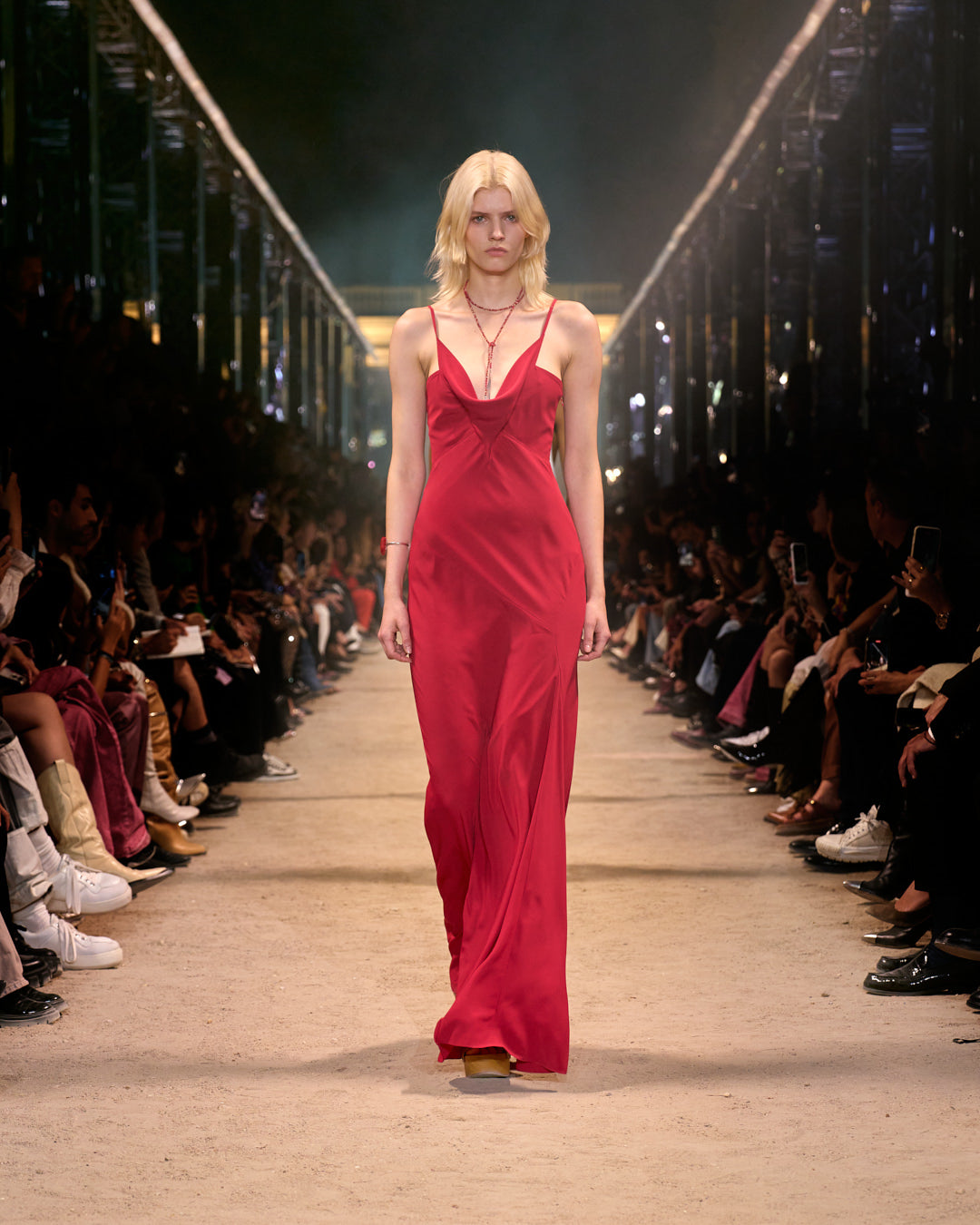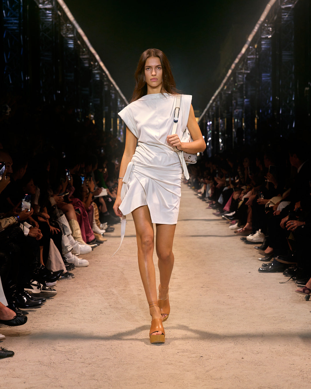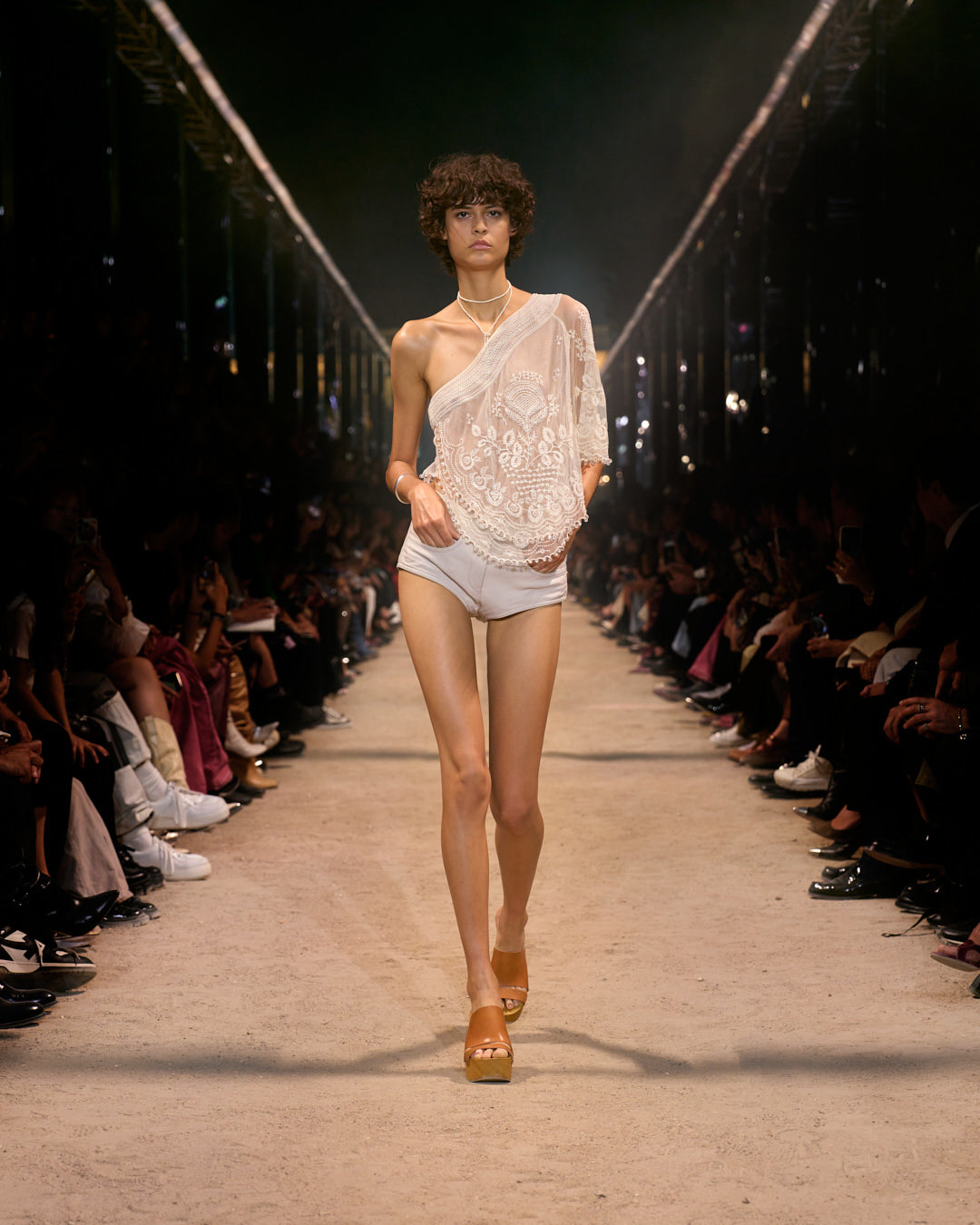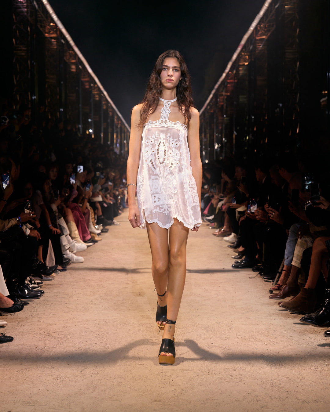 Die Kollektion weckt mit nonchalanter Poesie den Wunsch nach Leichtigkeit und Weiblichkeit, der bis zum Ende der Modenschau an einem wilden und prickelnden Abend verkörpert wird.