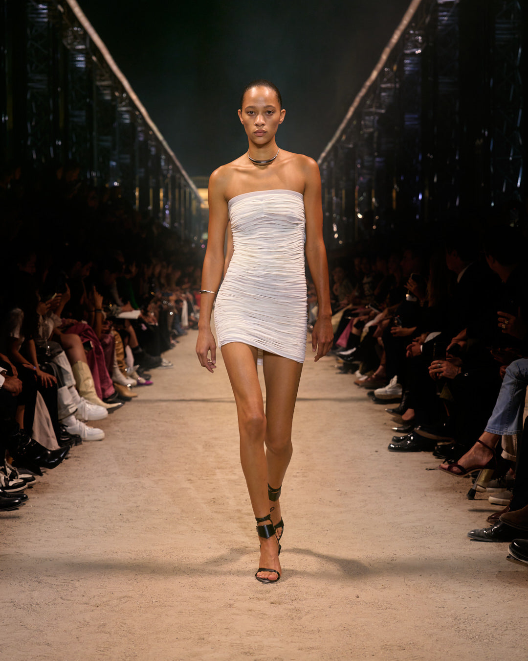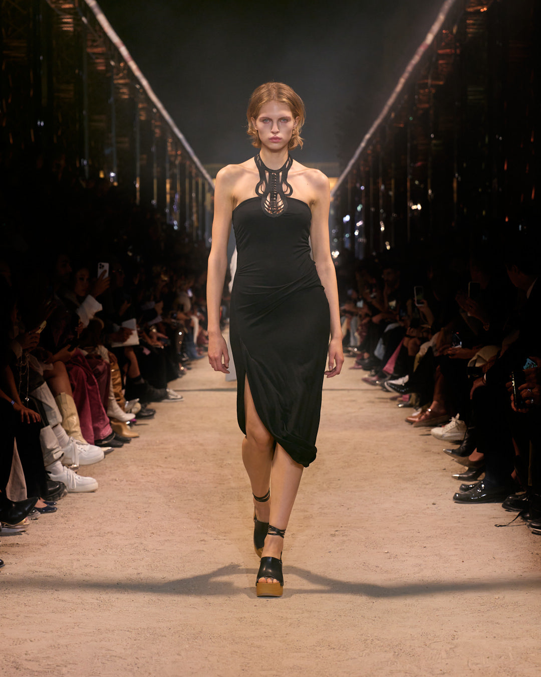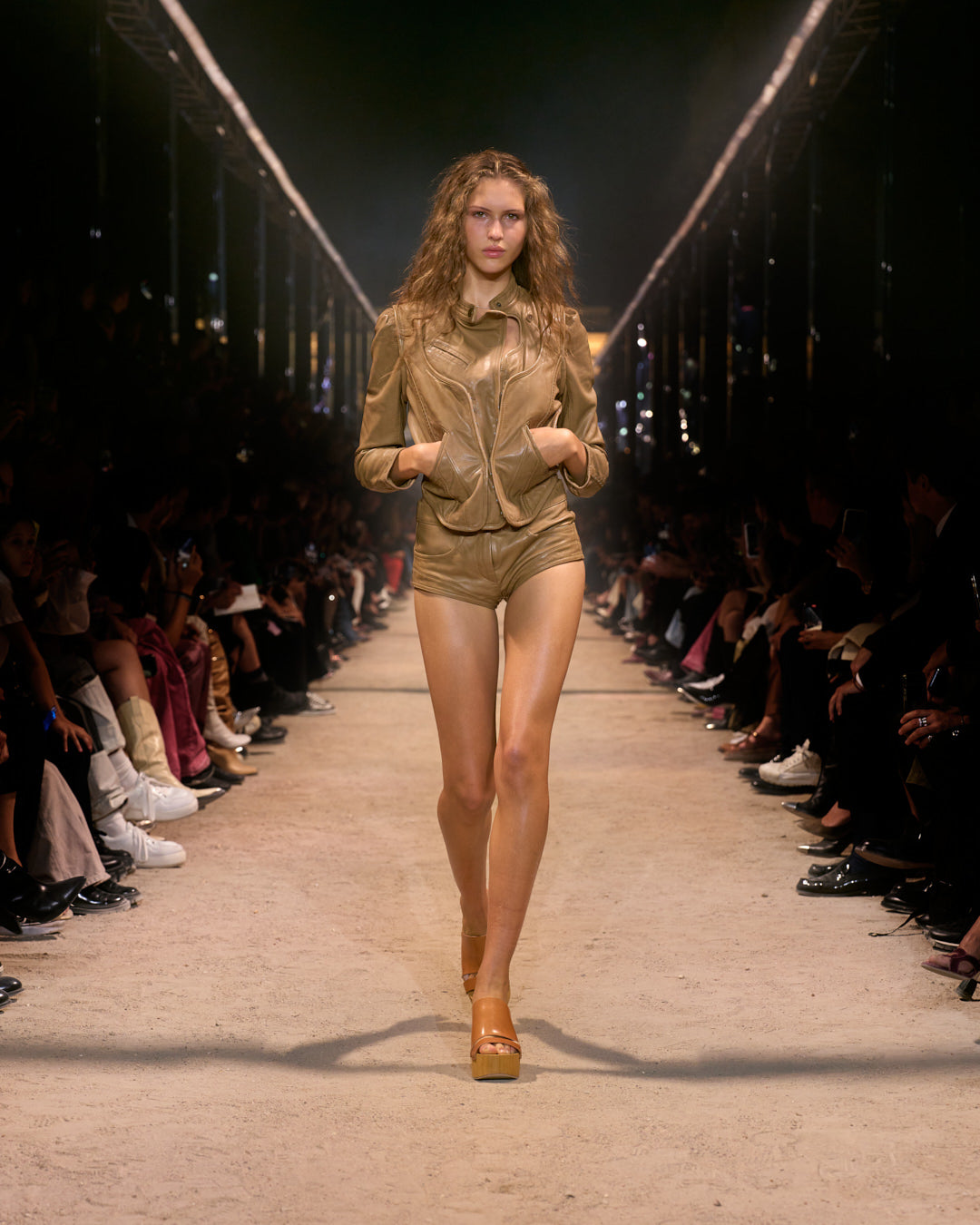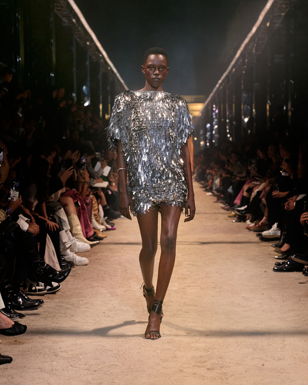 Die Kollektion weckt mit nonchalanter Poesie den Wunsch nach Leichtigkeit und Weiblichkeit, der bis zum Ende der Modenschau an einem wilden und prickelnden Abend verkörpert wird.