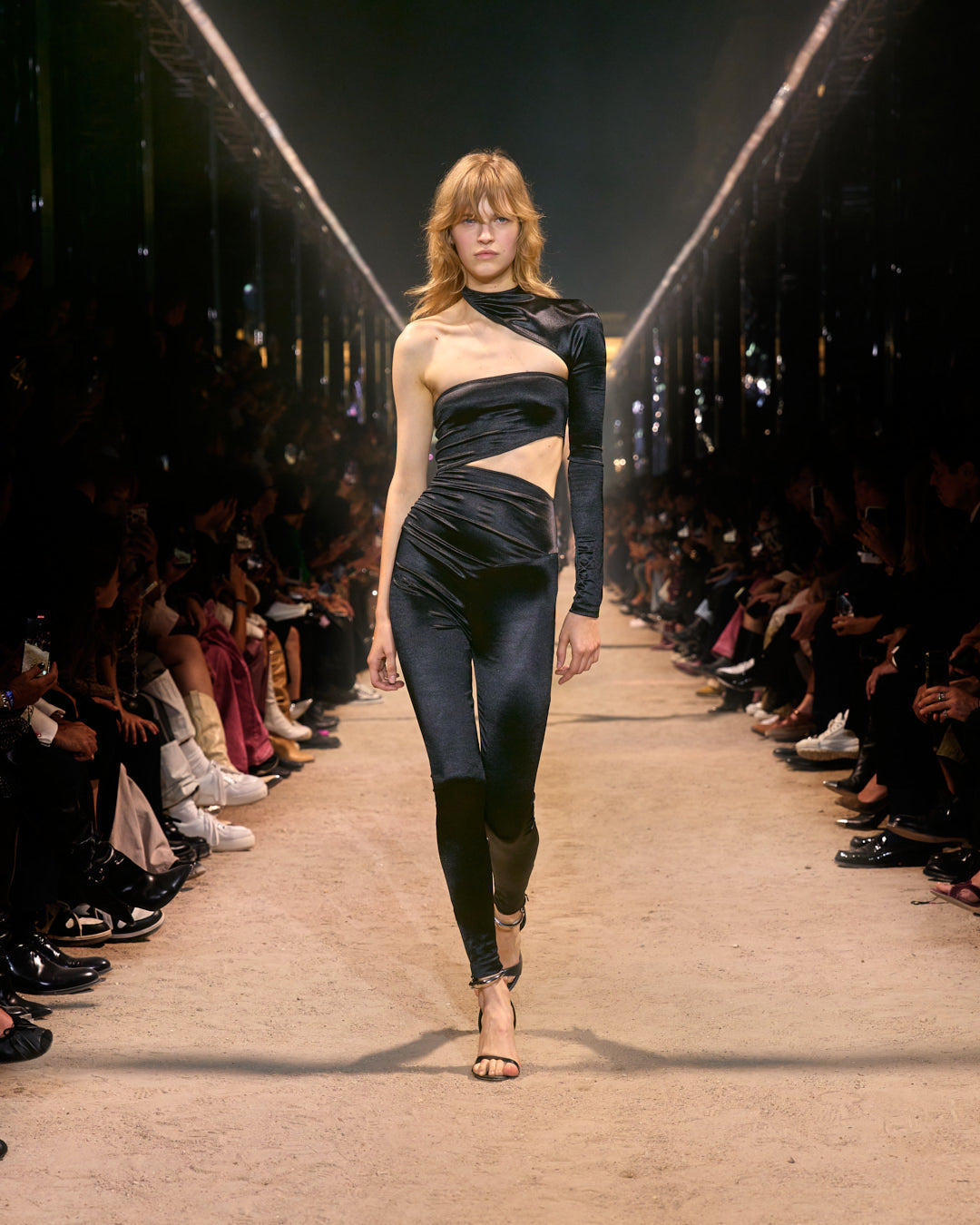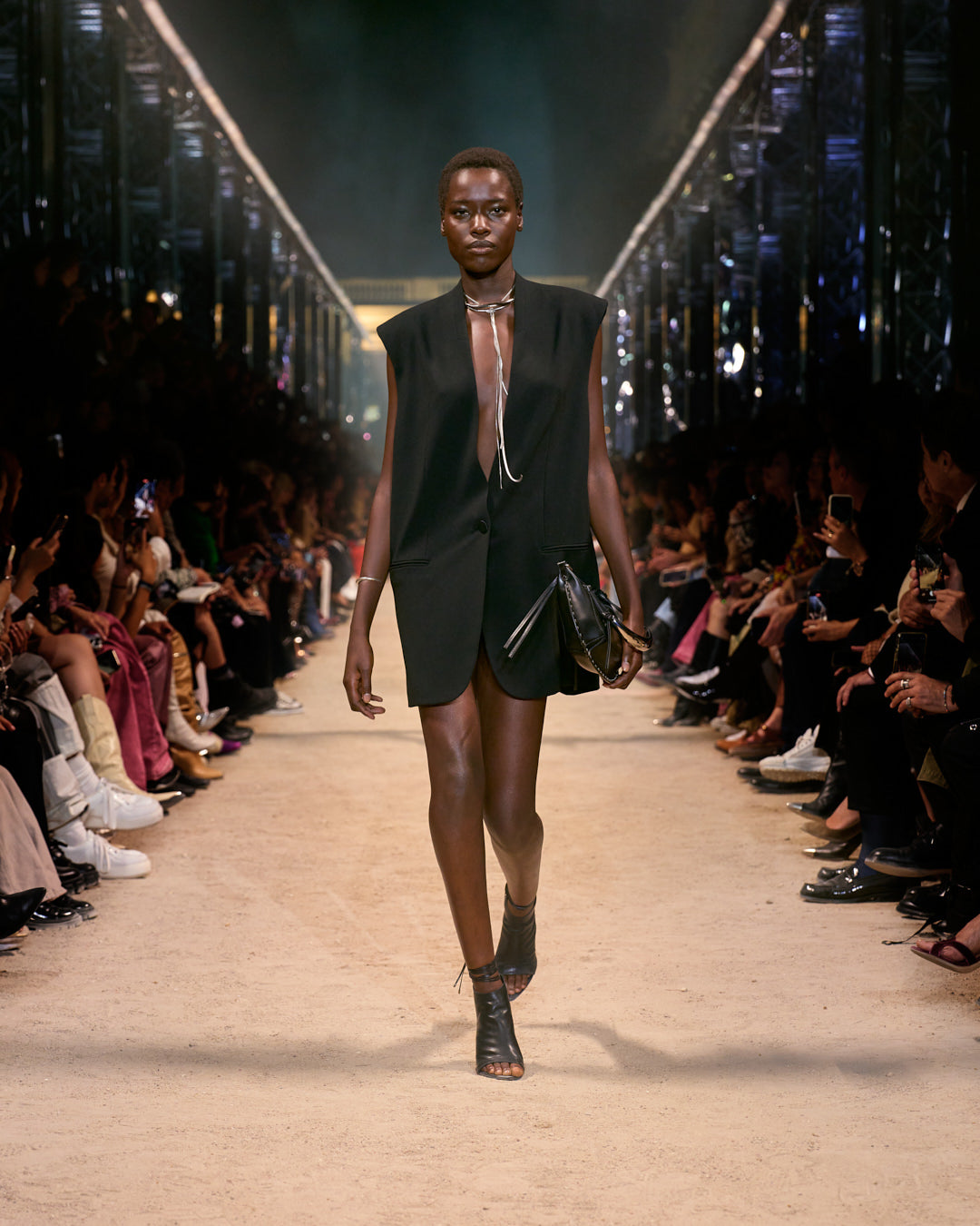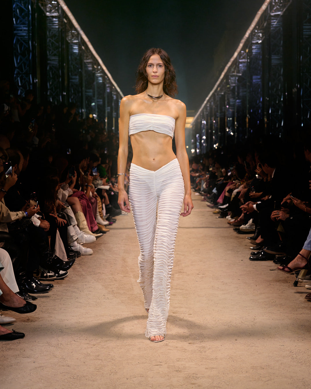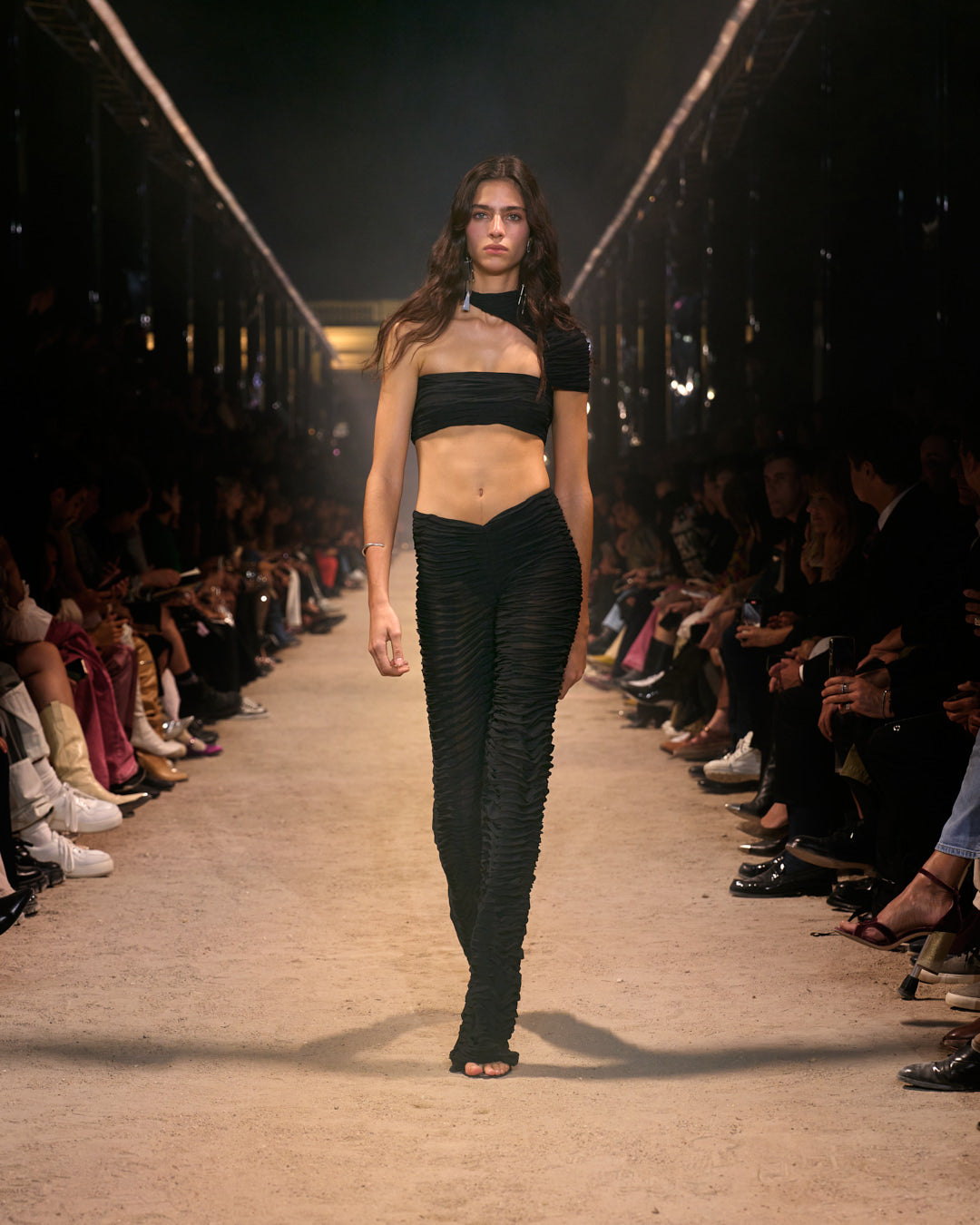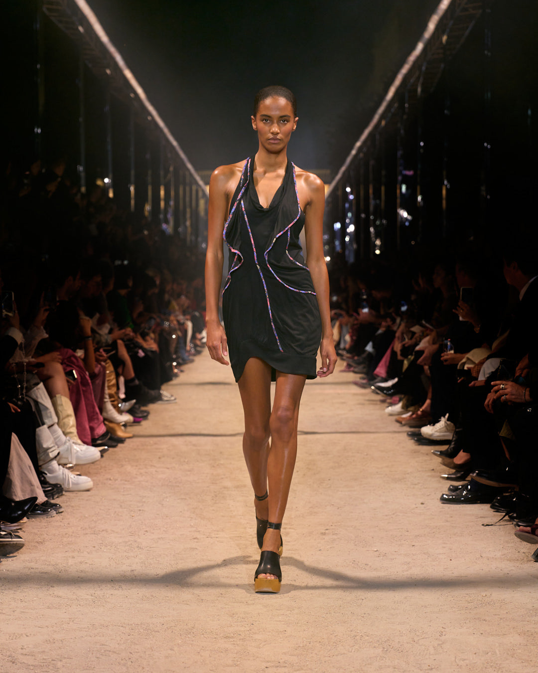 Die Kollektion weckt mit nonchalanter Poesie den Wunsch nach Leichtigkeit und Weiblichkeit, der bis zum Ende der Modenschau an einem wilden und prickelnden Abend verkörpert wird.