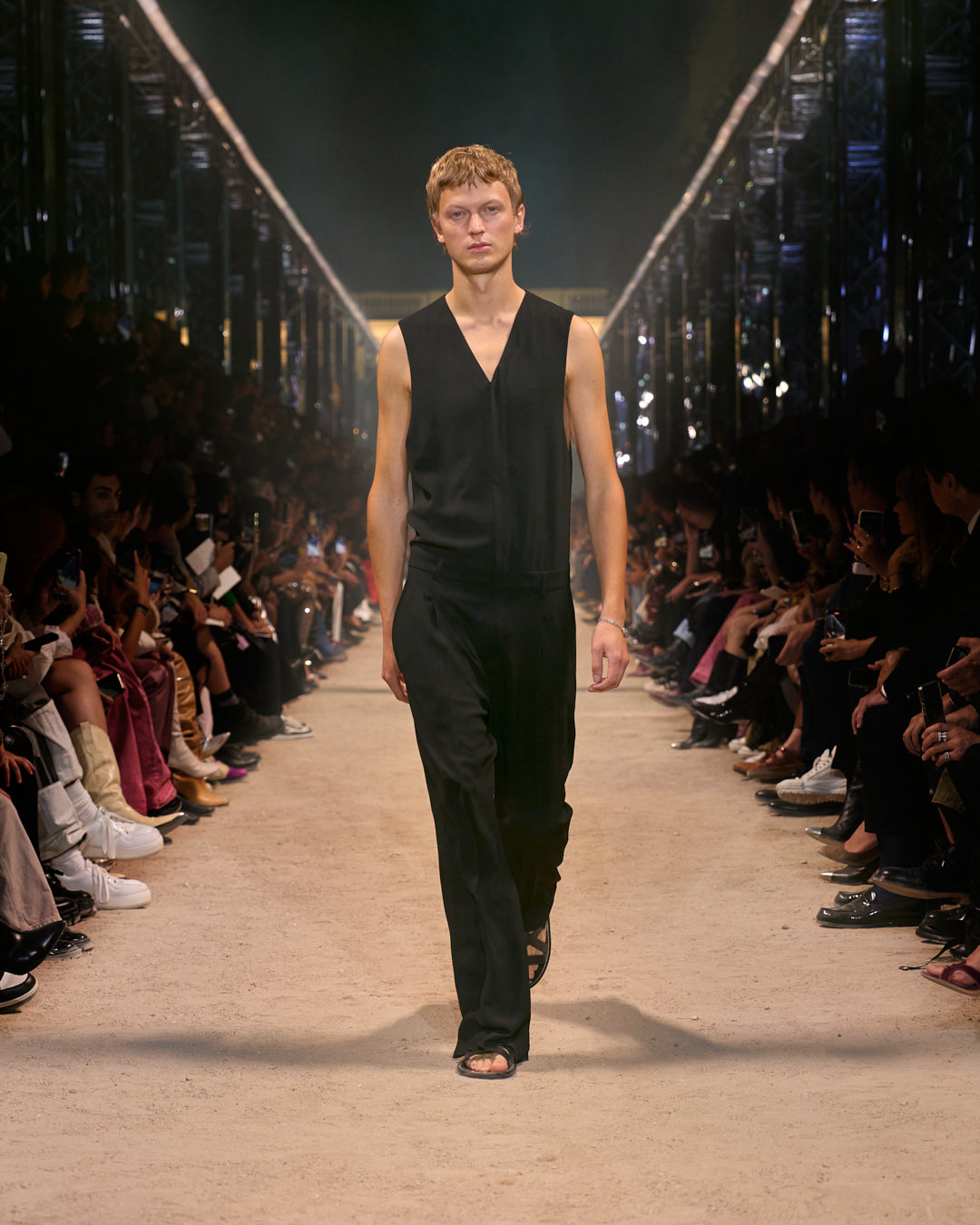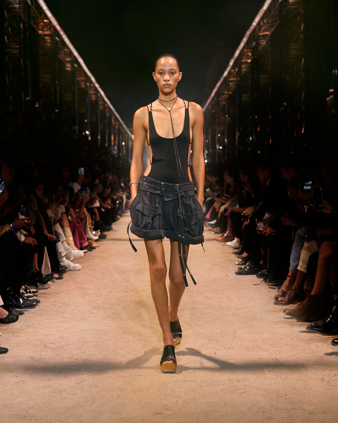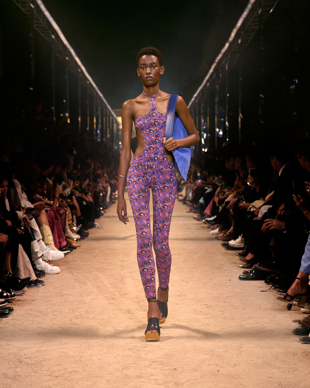 Sie manifestiert sich in der Mode durch Fallschirmstoffe und Keil-Clogs, die den Flug der Silhouette begleiten. Imposante Ohrringe mit metallischen Reflexen schweben wie Mobiles und werden vom Laufrhythmus beeinflusst.