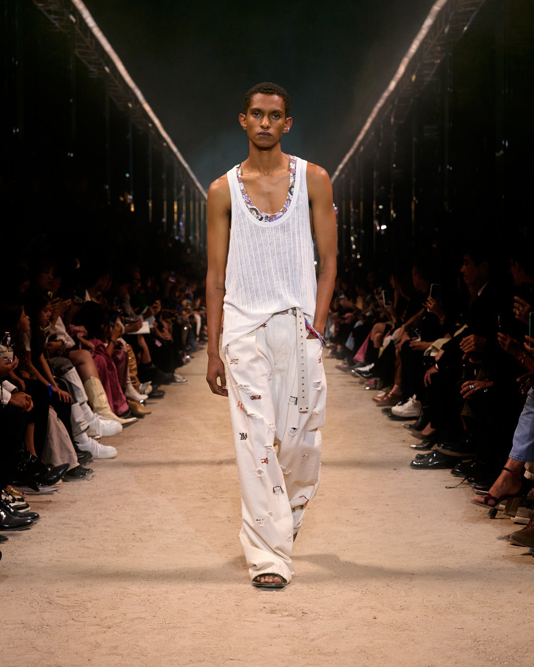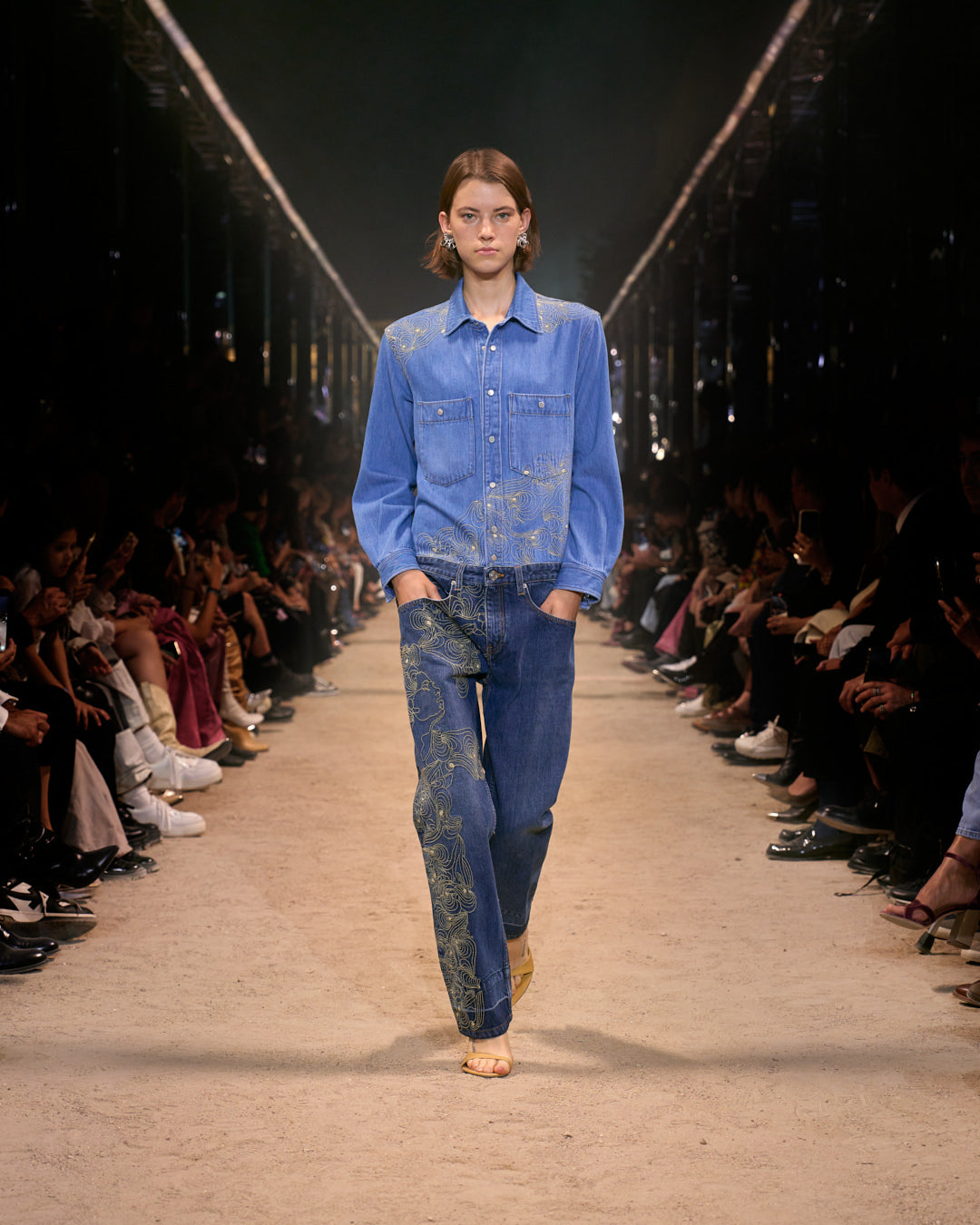 Darüber hinaus evozieren sie die Sternbilder aus Goldfäden auf Jeans-Outfits und spiegeln das blaue Licht wider, das in die Gärten des Palais Royal getaucht wird, wo die jungen Frauen von Isabel Marant unter freiem Himmel vorbeiziehen. Diese mystische und himmlische Dimension wird durch den Soundtrack der Modenschau hervorgerufen, der von Kazu Makino komponiert und von seiner Gruppe Blonde Redhead interpretiert wird.