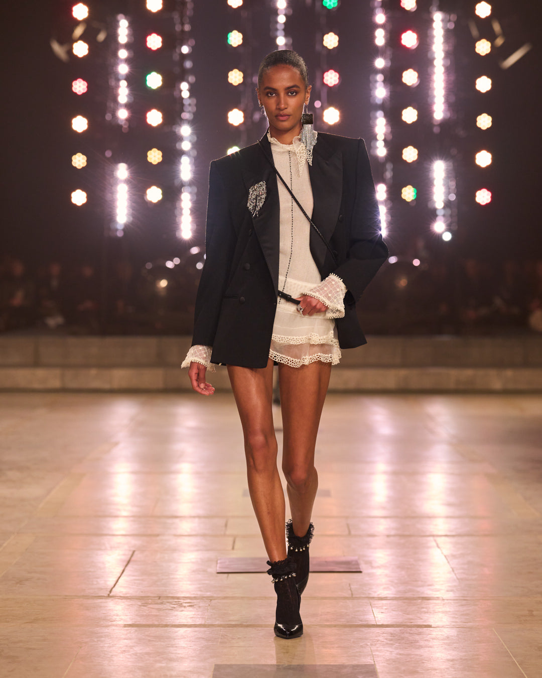 Eine Smokingjacke mit breiten Schultern und Satinrevers verzichtet auf die Hose und wird durch zarte Spitzenrüschen ersetzt. Neben durchsichtigen Schichten, fließenden Stoffen und von der Unterwäsche inspirierten Stücken kommt ein böhmischer Geist zum Vorschein.