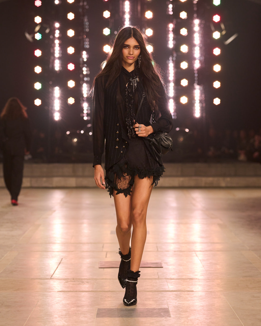 Dieses Stadtmädchen mischt die charakteristischen Codes von Isabel Marant mit einem Hauch von New Wave, wenn durchsichtige Guipure, weiße, schwarz gepunktete Lederstiefel und handwerklich gefertigte Accessoires aus Ketten und Sicherheitsnadeln über den Laufsteg gehen.