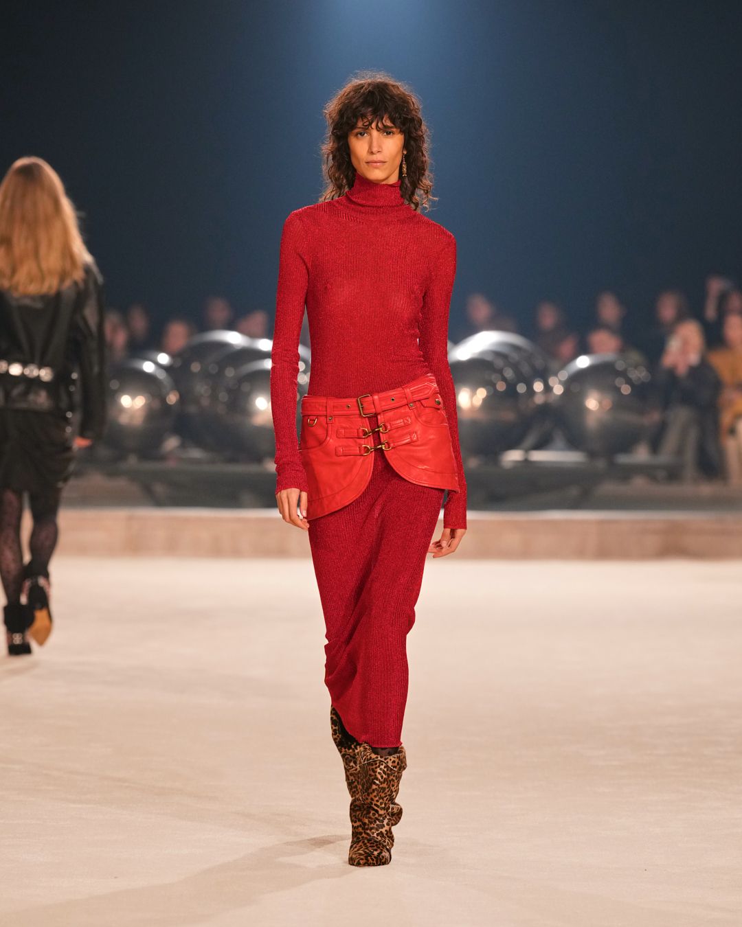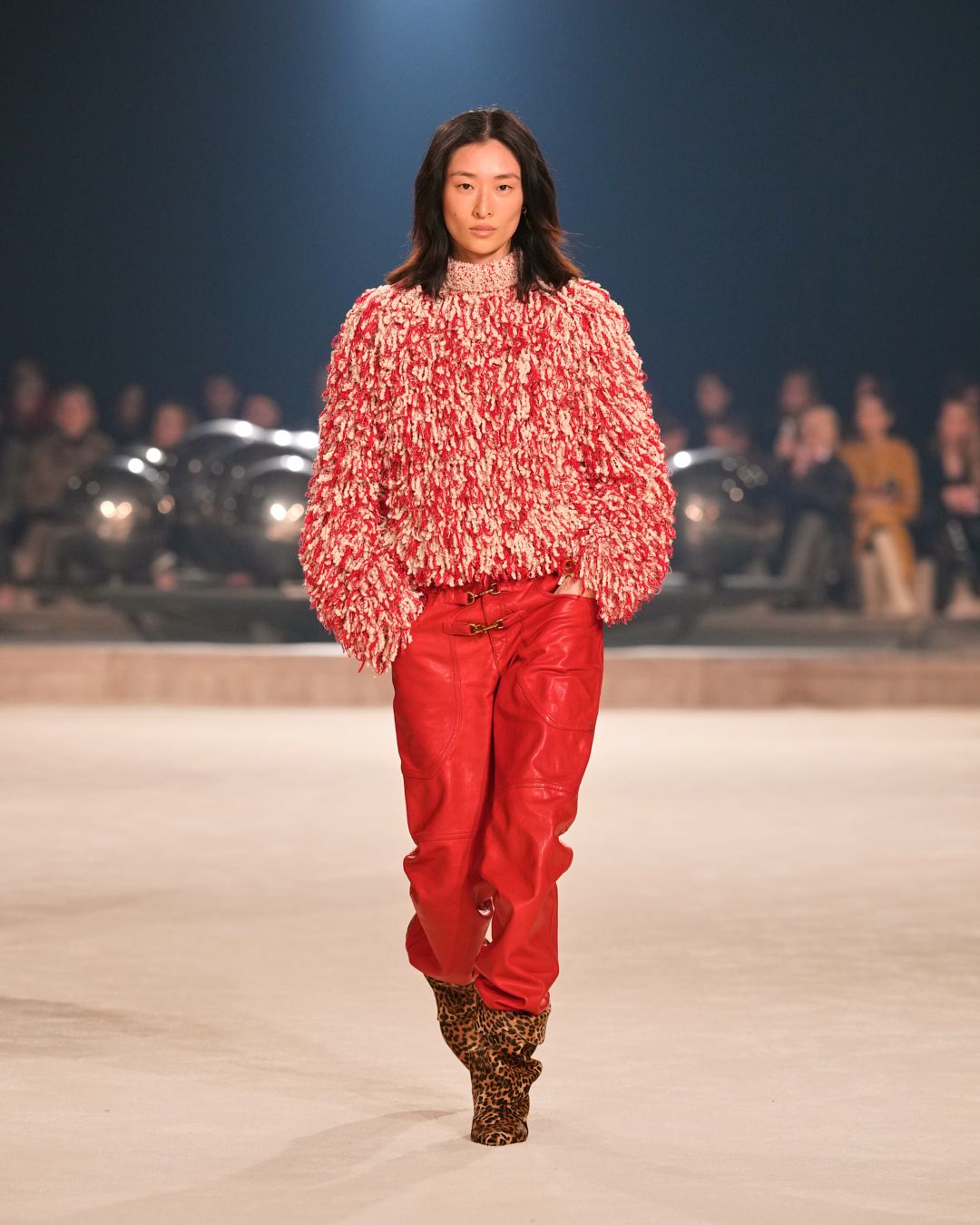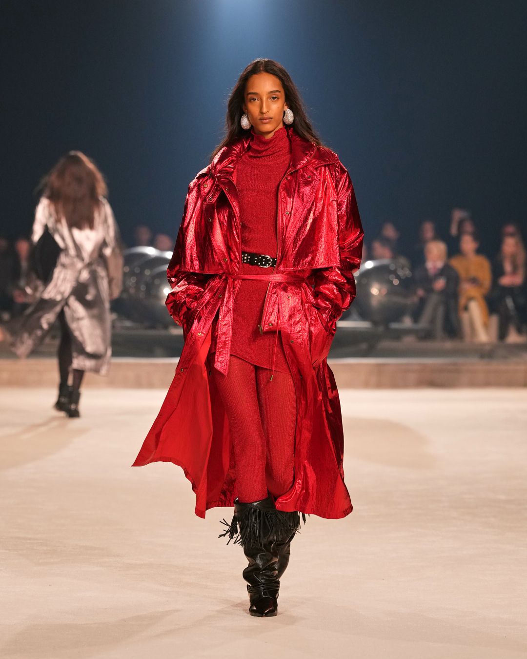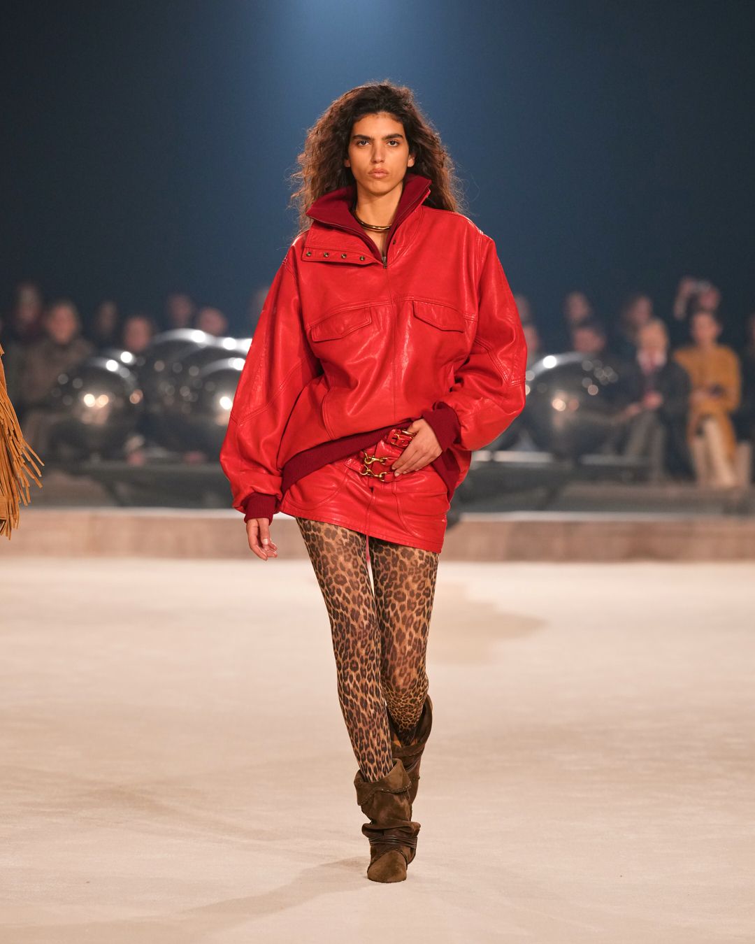 Natural materials with a raw allure intertwine with technical fabrics. A neon red electrifies the collection, narrating the restless nature of the Isabel Marant woman. This energy reverberates through the fiery undulations of the runway’s Hispanic-infused soundtrack.
