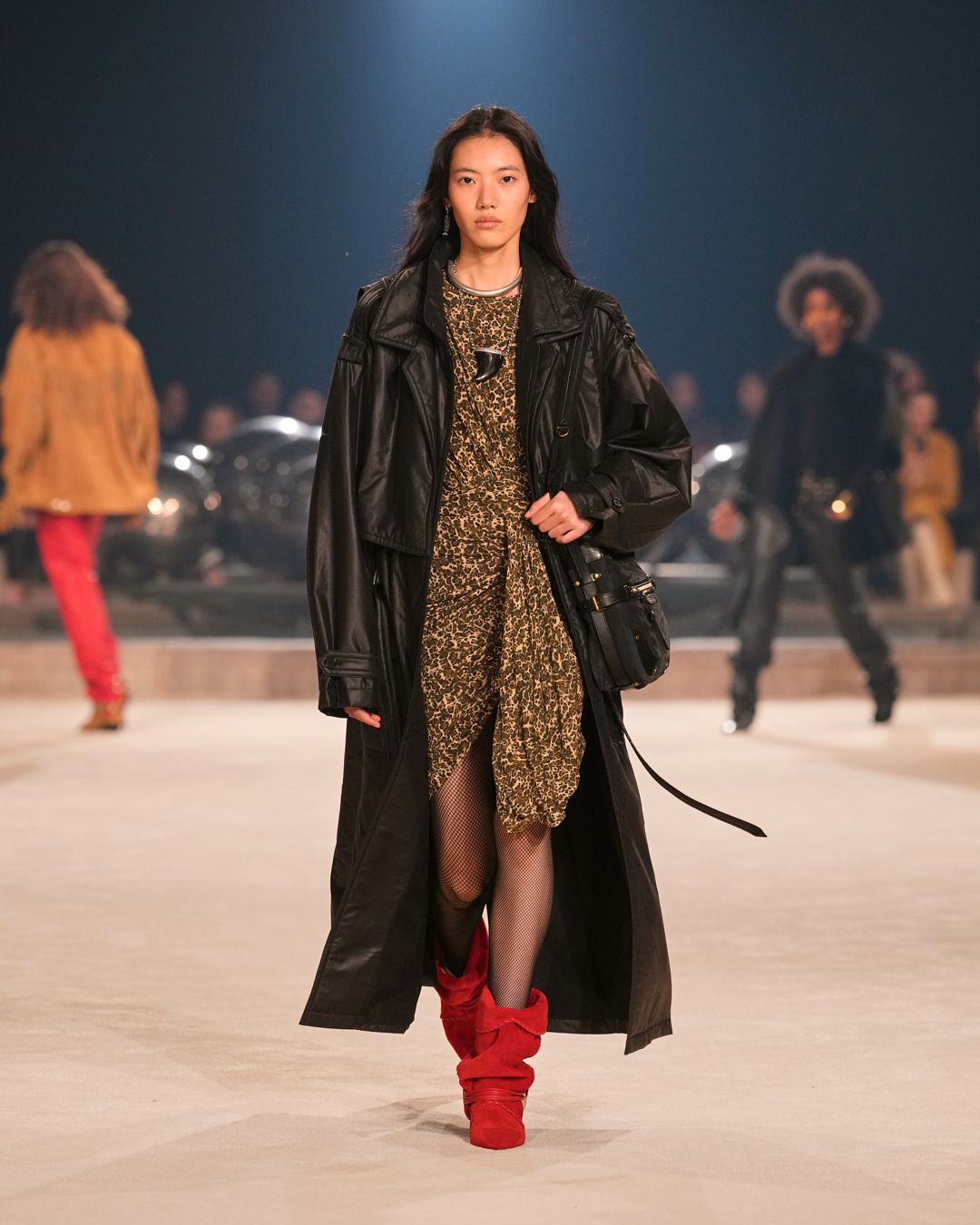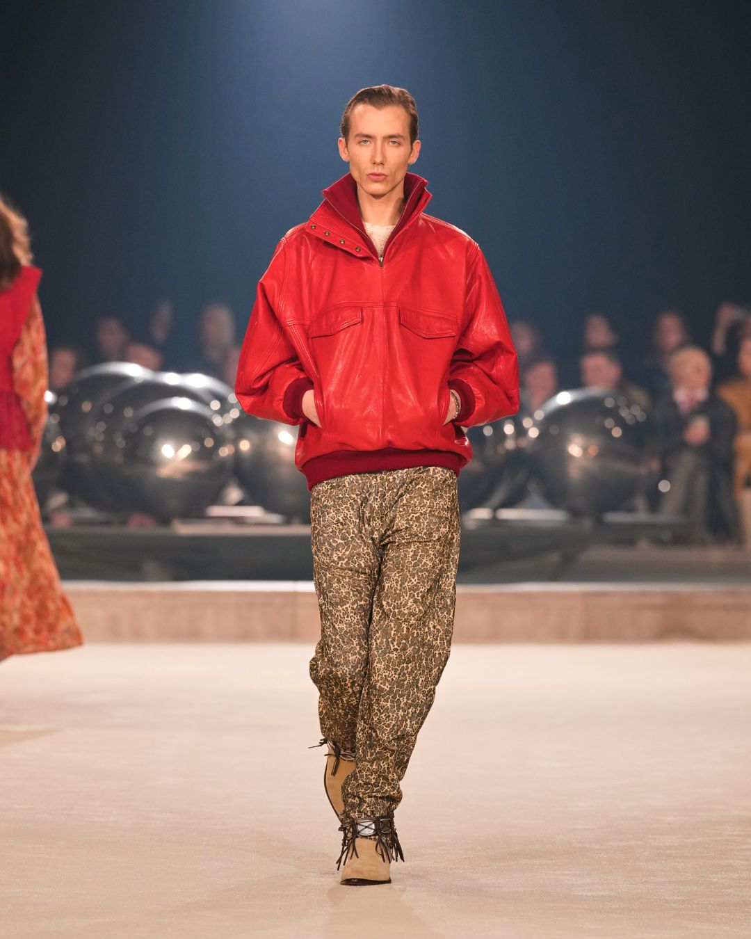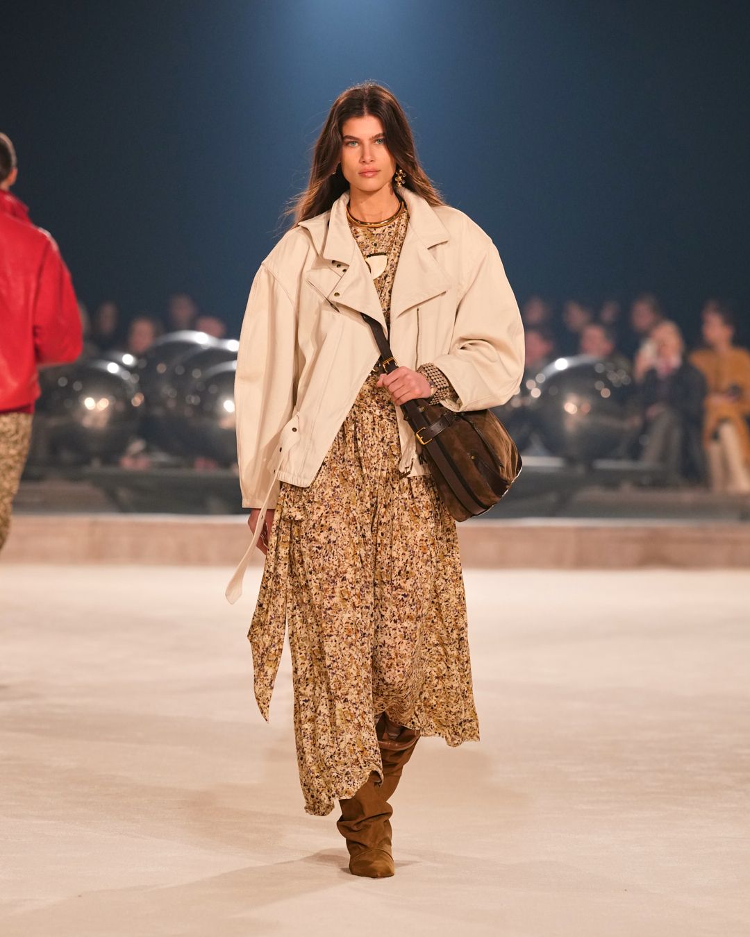 Natural materials with a raw allure intertwine with technical fabrics. A neon red electrifies the collection, narrating the restless nature of the Isabel Marant woman. This energy reverberates through the fiery undulations of the runway’s Hispanic-infused soundtrack.