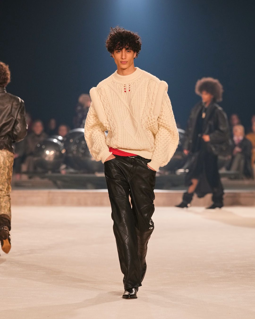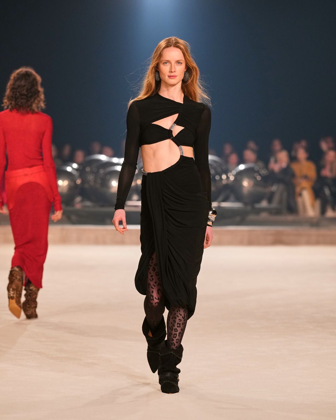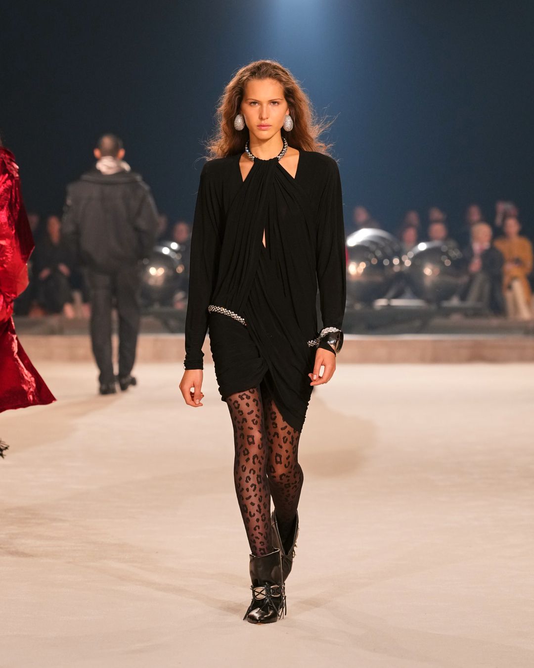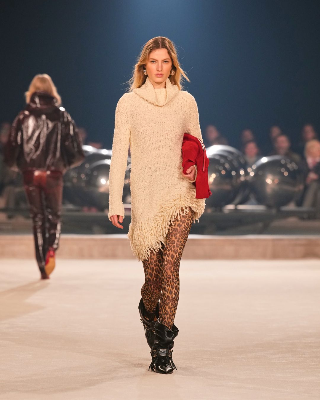 Natural materials with a raw allure intertwine with technical fabrics. A neon red electrifies the collection, narrating the restless nature of the Isabel Marant woman. This energy reverberates through the fiery undulations of the runway’s Hispanic-infused soundtrack.