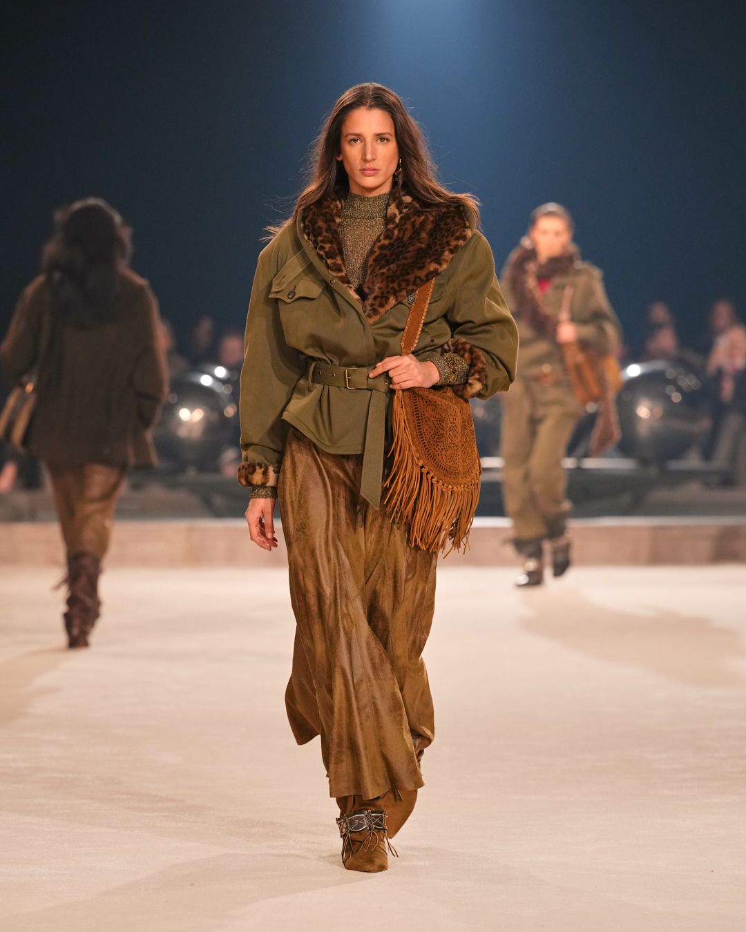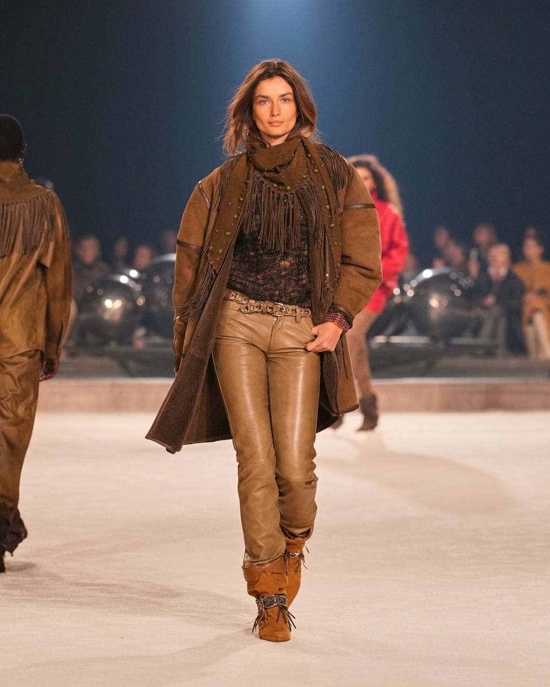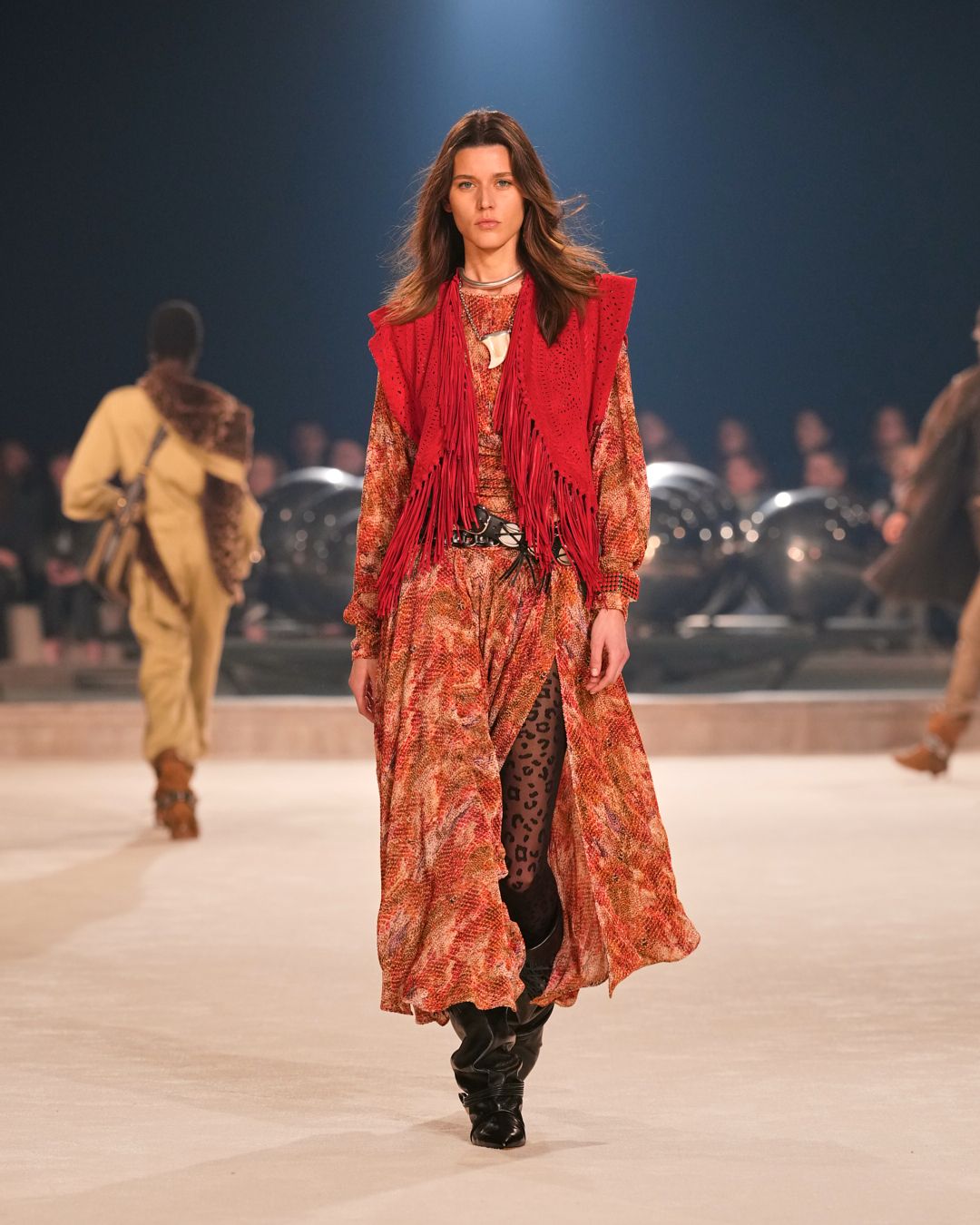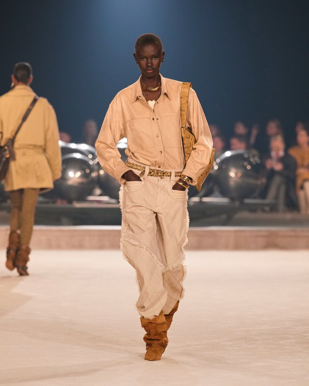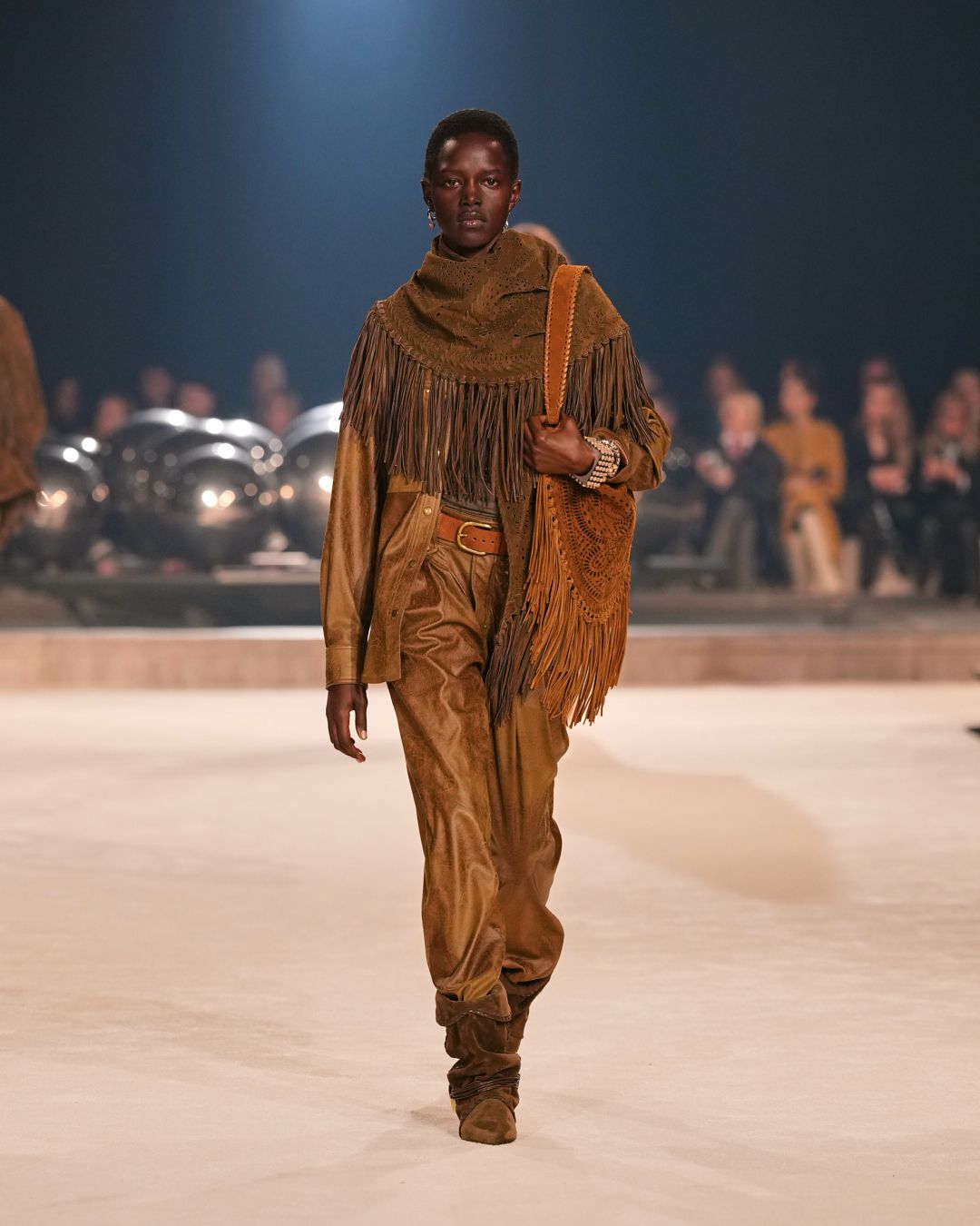 The patinas of sun-kissed suedes and the imposing jewel belts cinching waists or gracing boots evoke a sense of wanderlust, vast plains, and desert horizons.