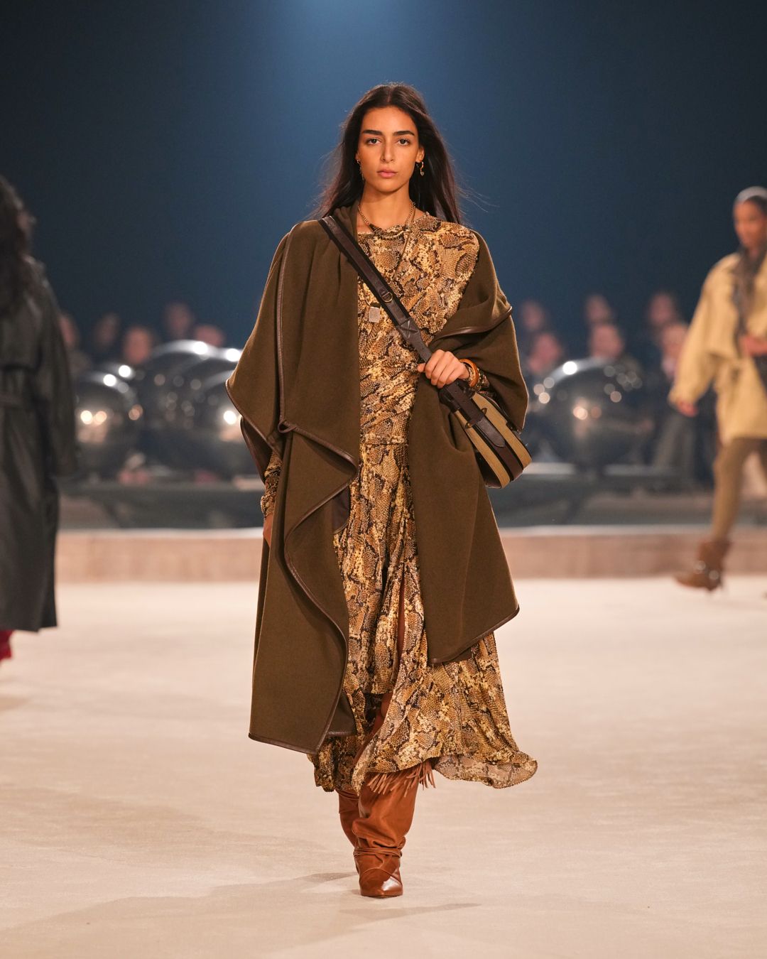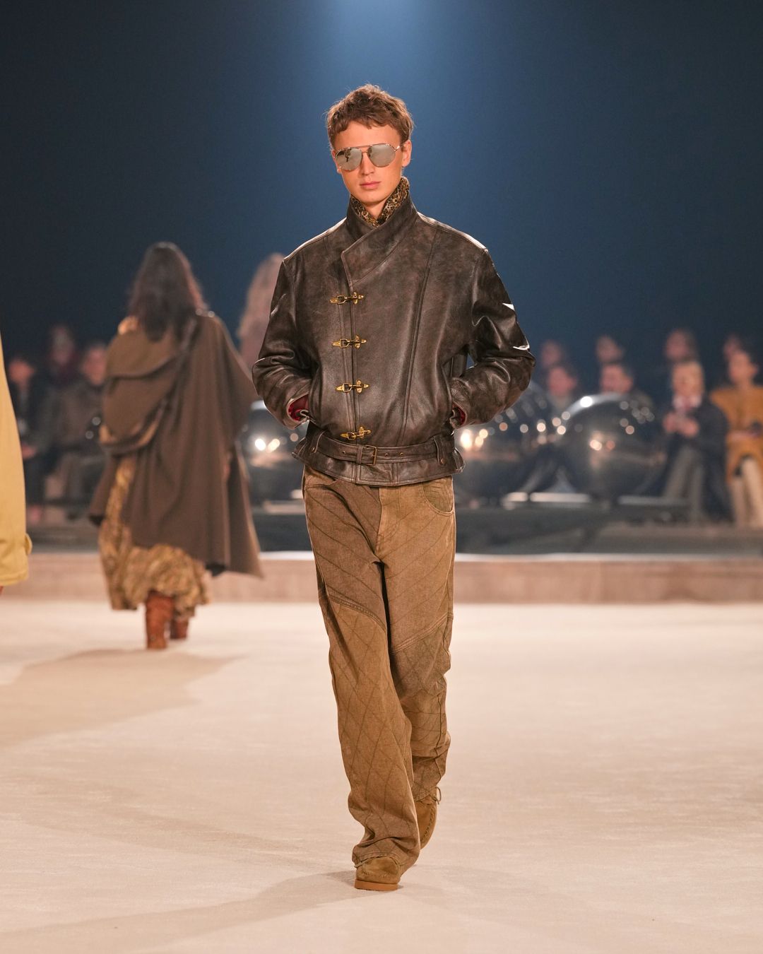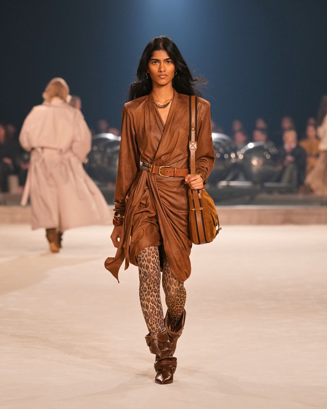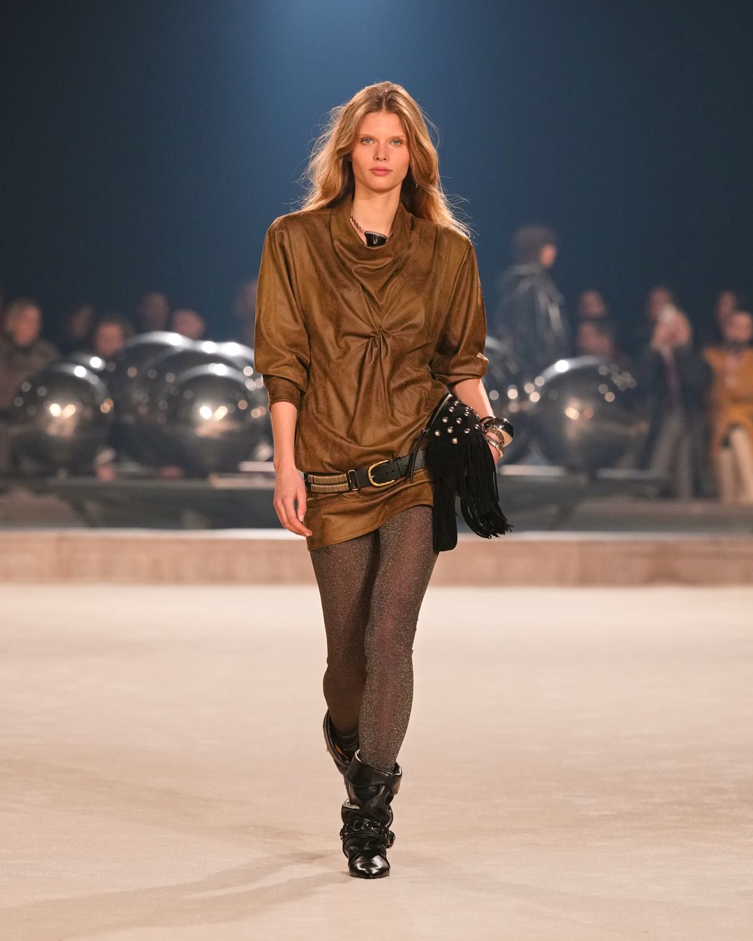 The patinas of sun-kissed suedes and the imposing jewel belts cinching waists or gracing boots evoke a sense of wanderlust, vast plains, and desert horizons.