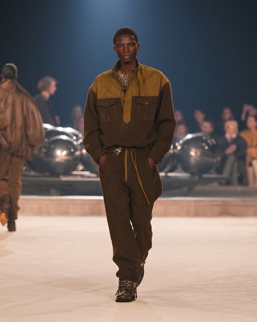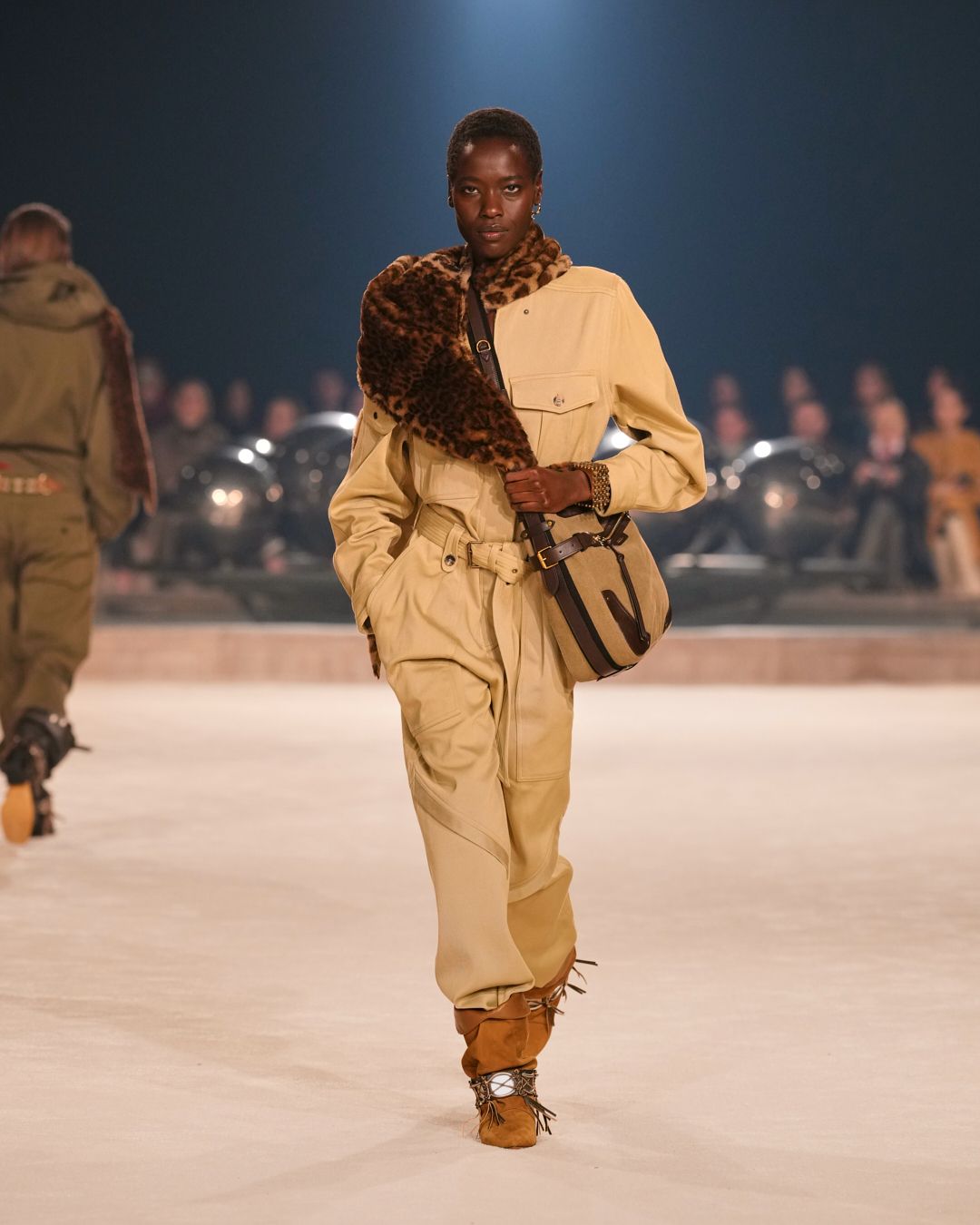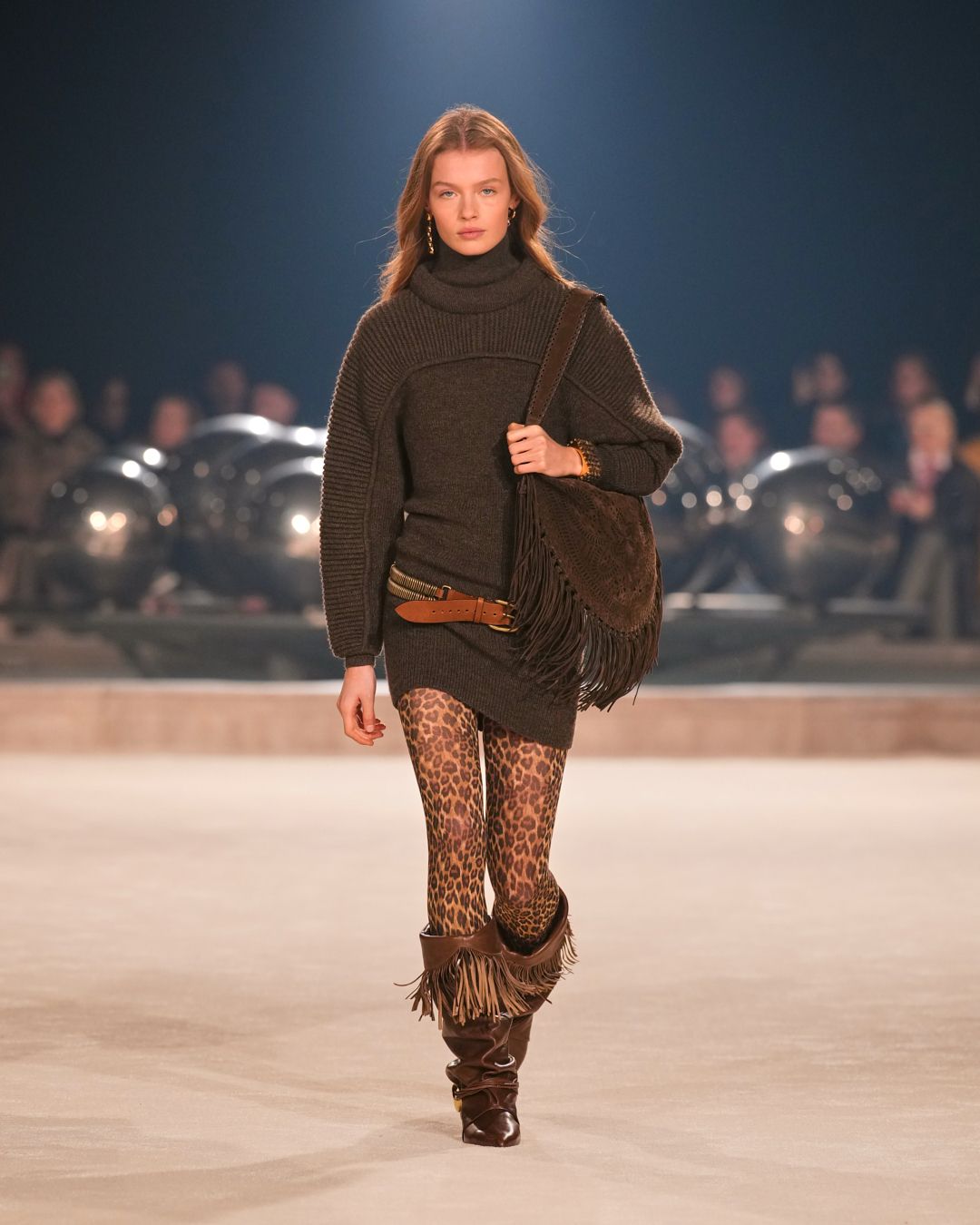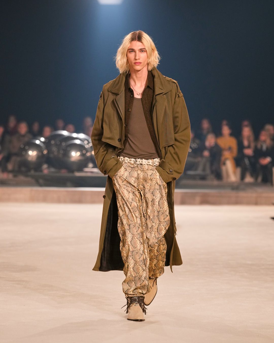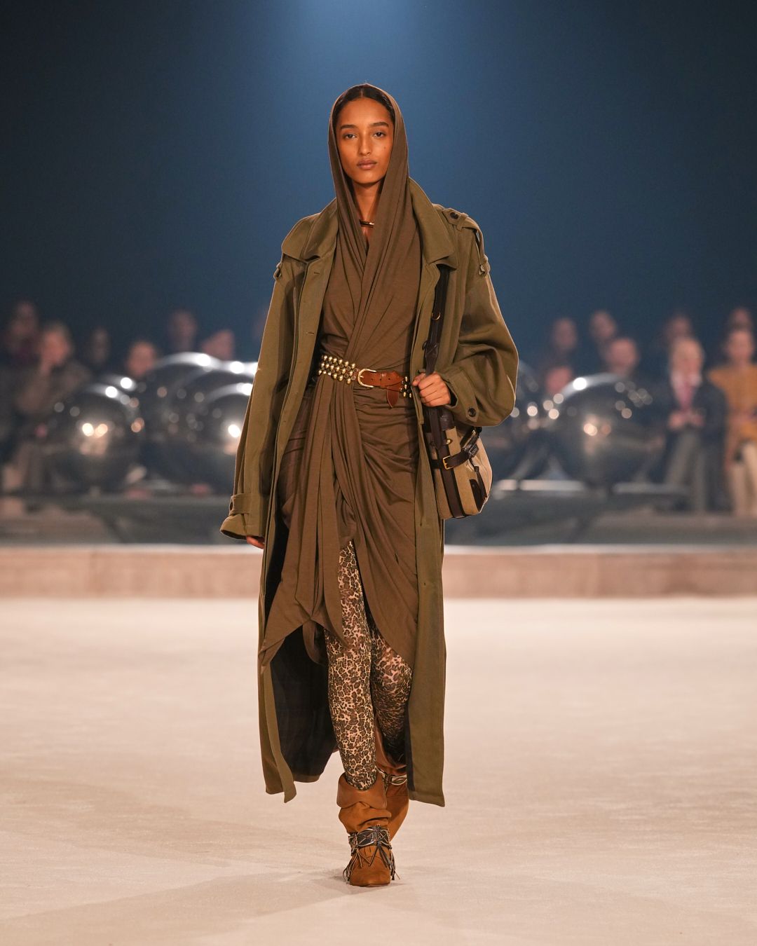 The patinas of sun-kissed suedes and the imposing jewel belts cinching waists or gracing boots evoke a sense of wanderlust, vast plains, and desert horizons.