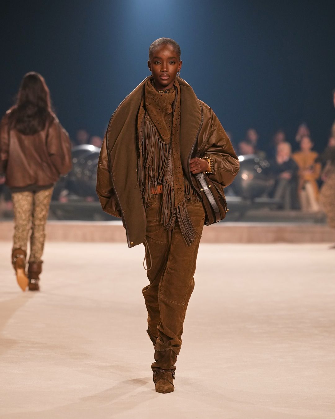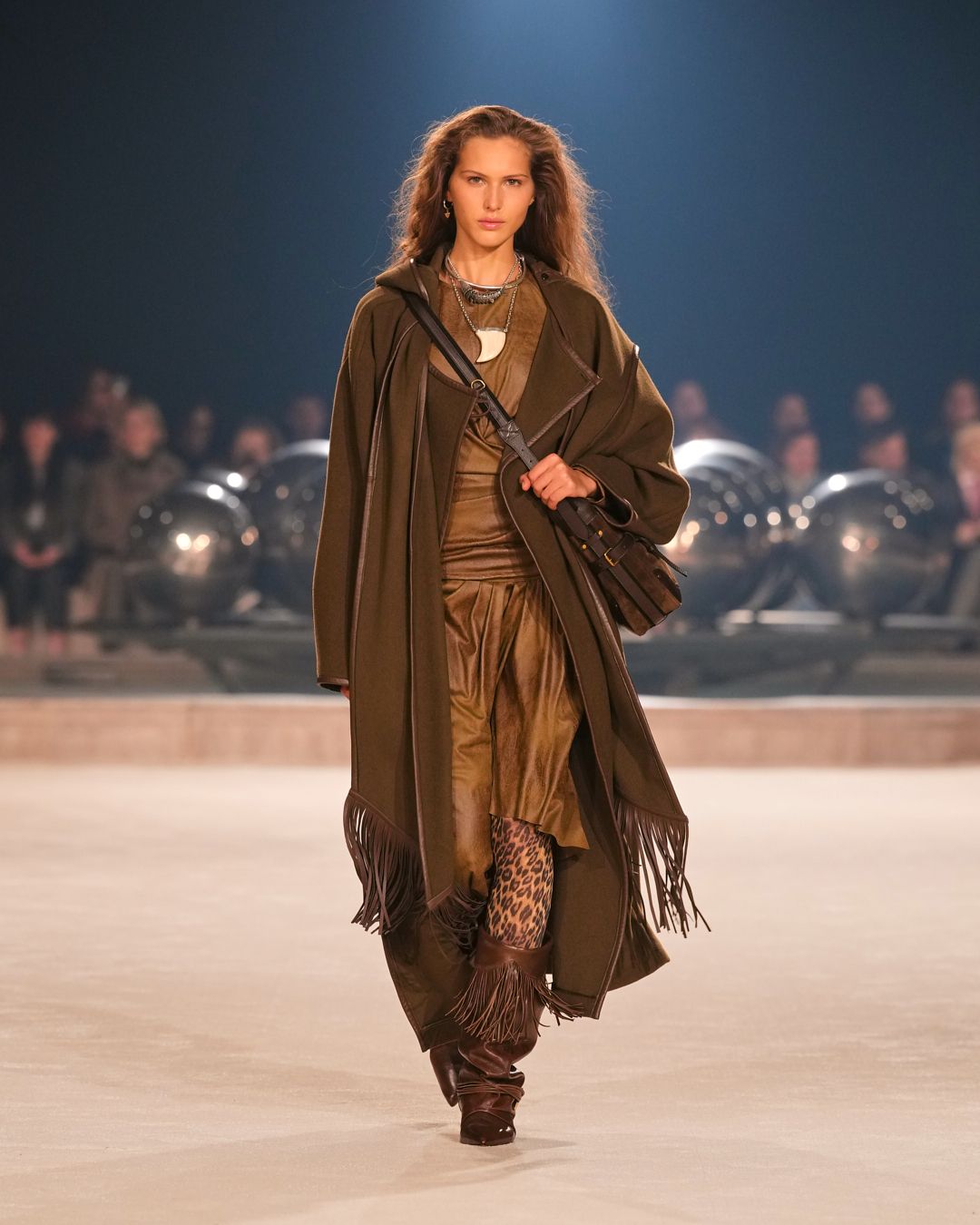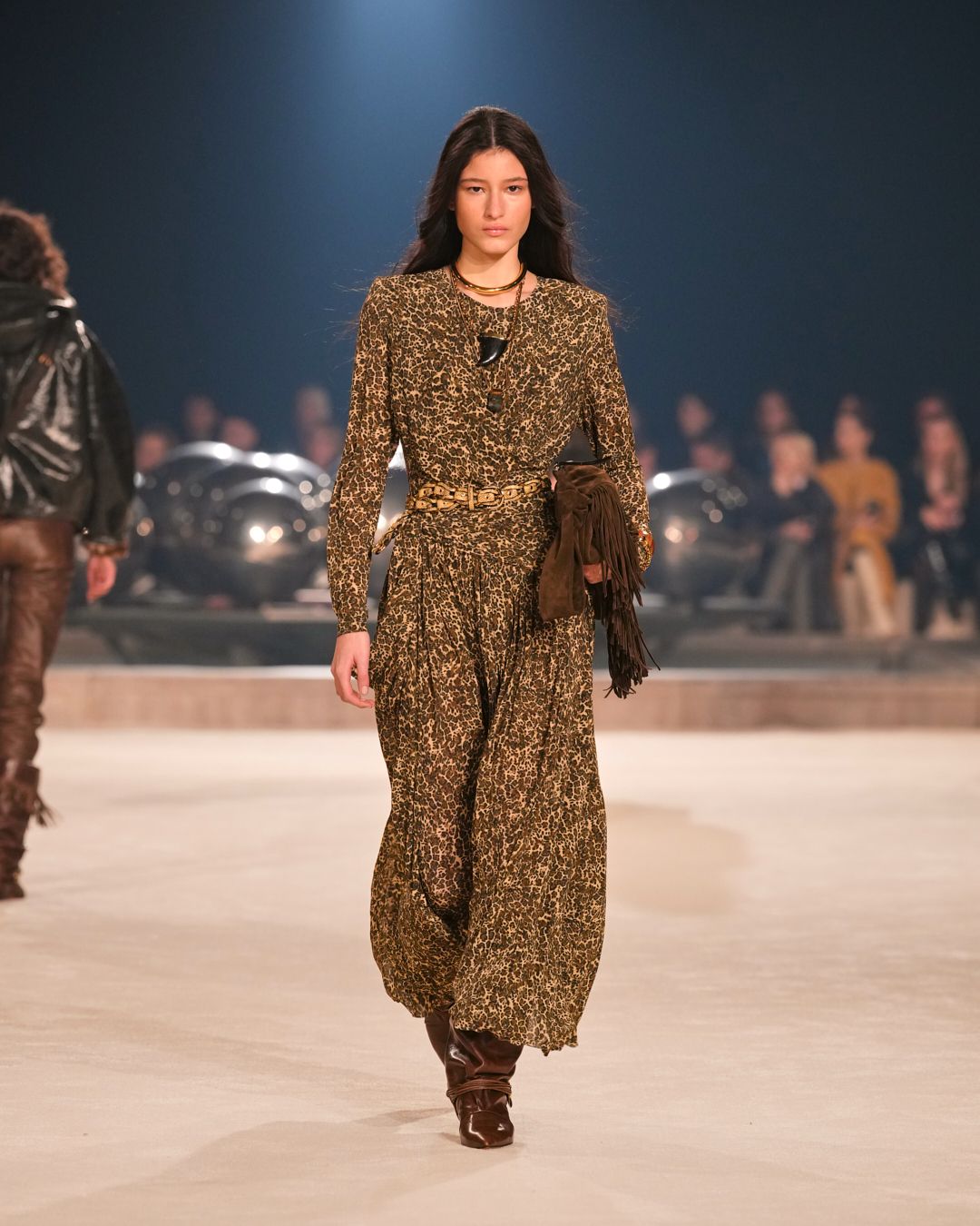 A gaucho spirit, also embraced by the Isabel Marant boys, is further accentuated by the introduction of animal prints and cascading fringes along sleeves. Oversized suede scarves are perforated, studded, and embroidered with pearls—testaments to a dedication to craft.
