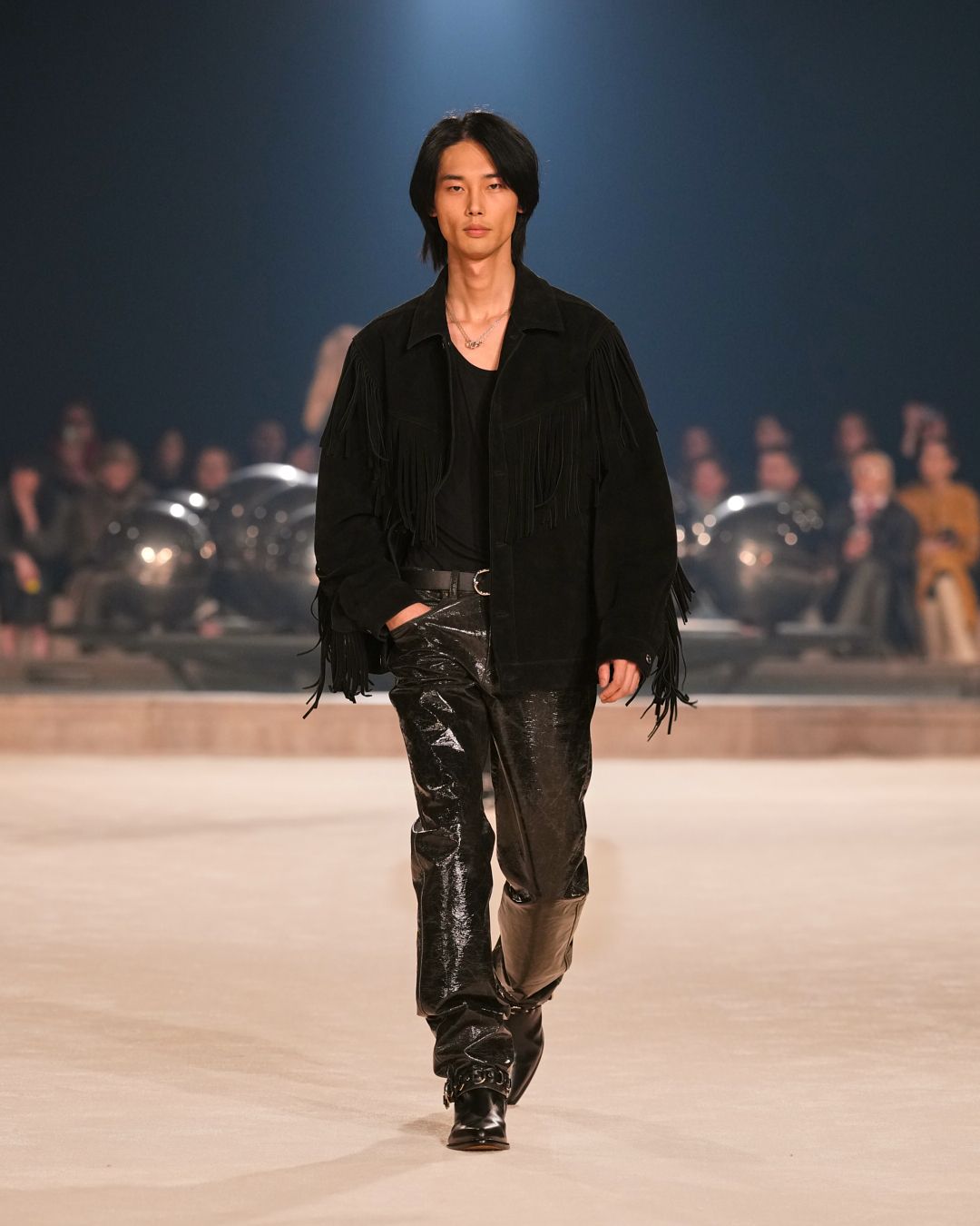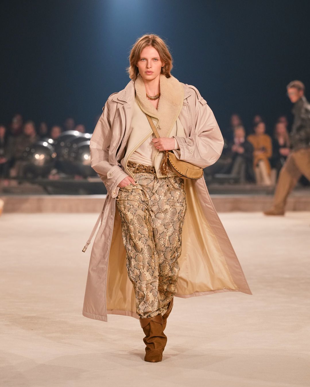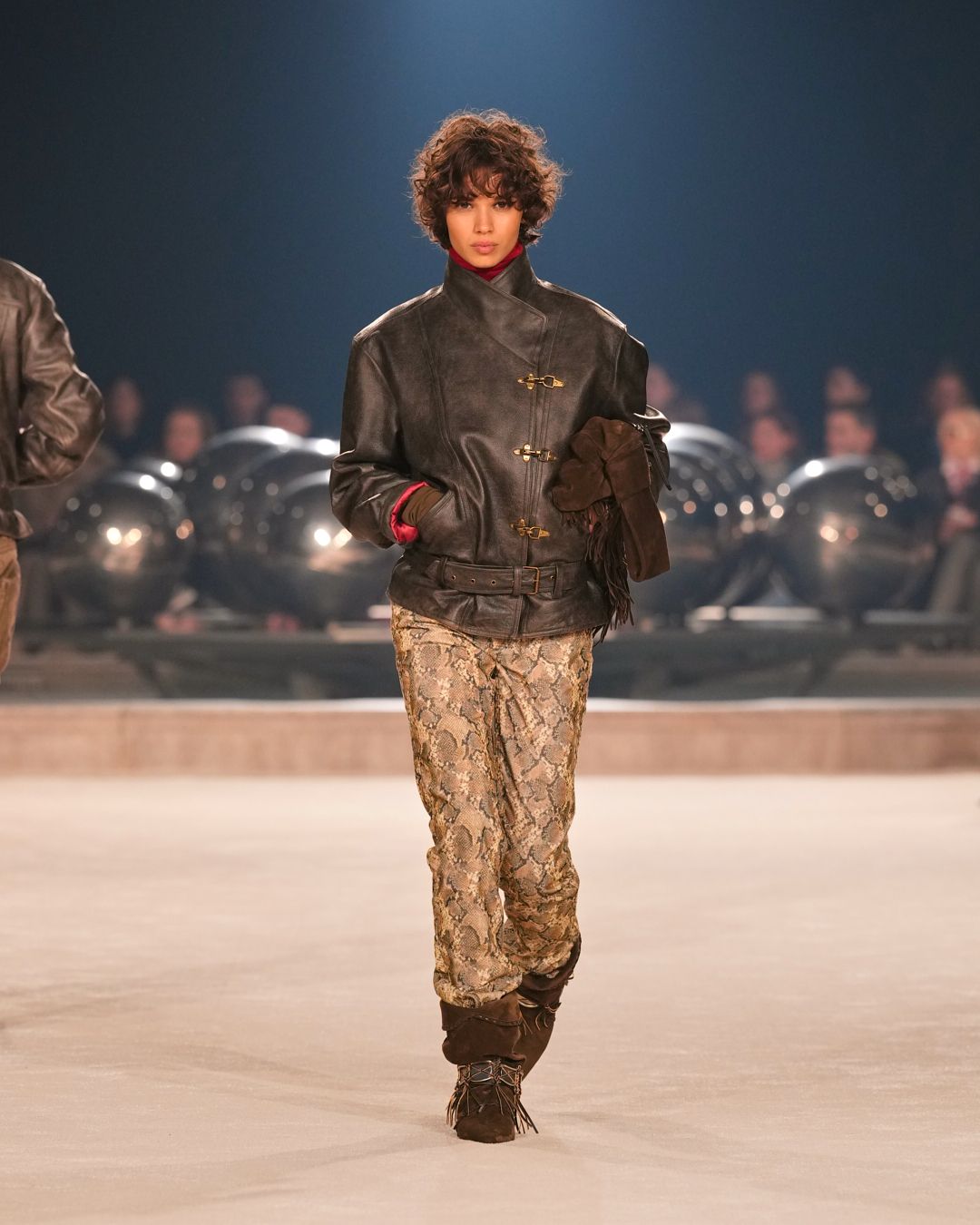 A gaucho spirit, also embraced by the Isabel Marant boys, is further accentuated by the introduction of animal prints and cascading fringes along sleeves. Oversized suede scarves are perforated, studded, and embroidered with pearls—testaments to a dedication to craft.