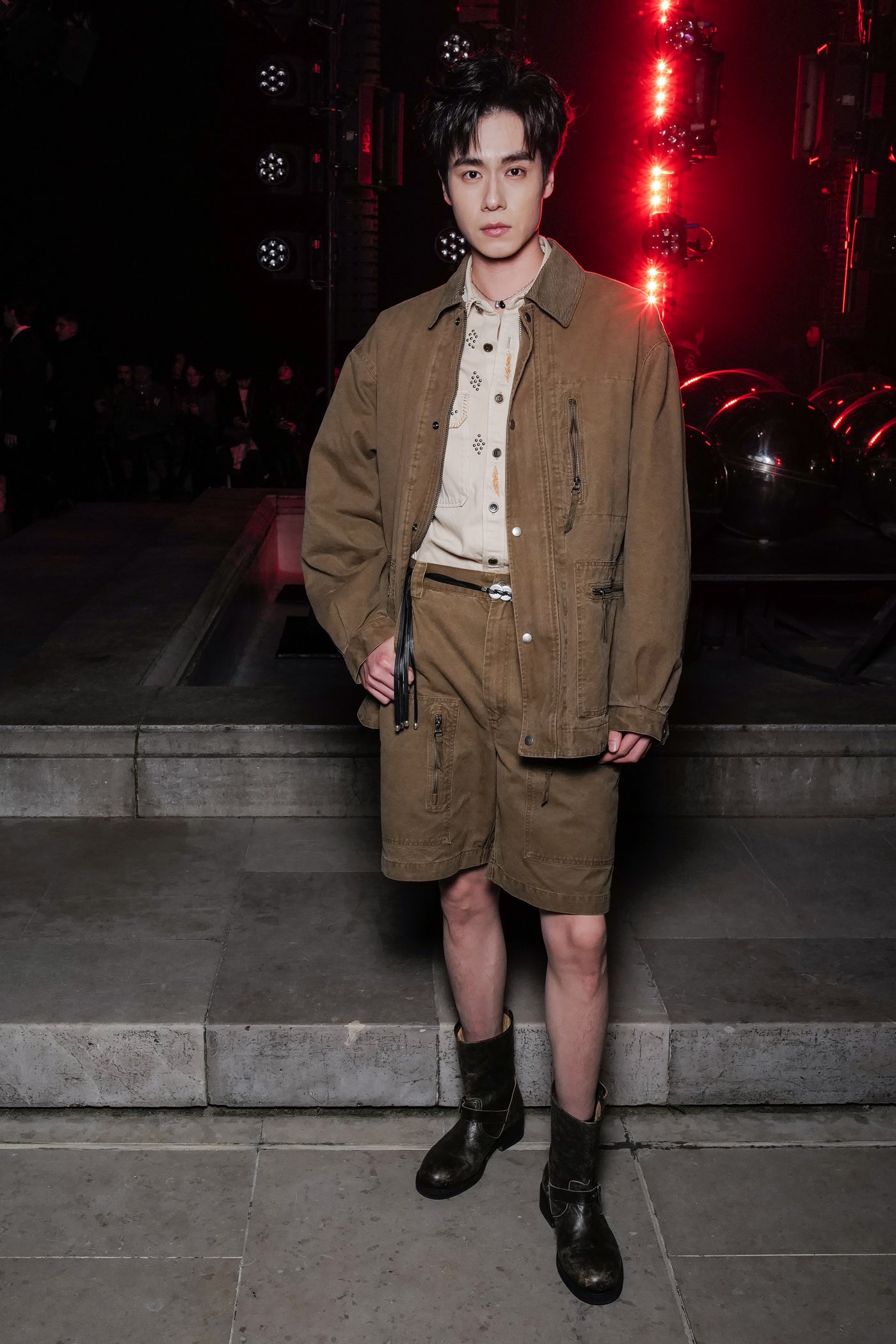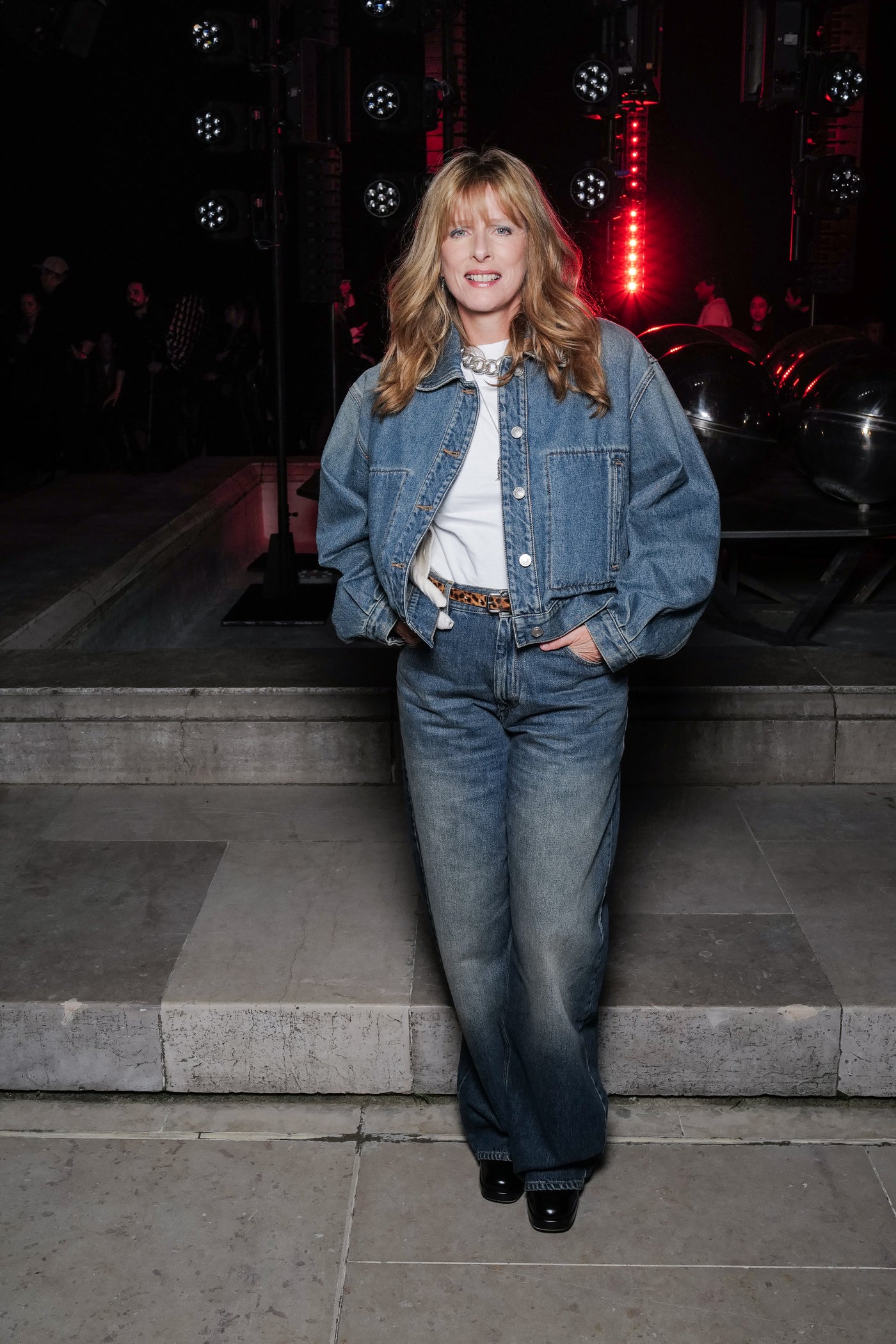 The runway set featuring the fountains of the Palais-Royal, illuminated by warm-colored spotlights in the background.