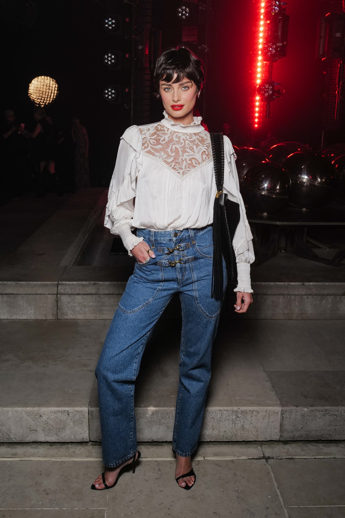 A tuxedo jacket with broad shoulders and satin lapels abandons trousers in favor of delicate lace ruffles. Alongside sheer layering, fluid fabrics, and lingerie-inspired pieces, a bohemian spirit emerges.