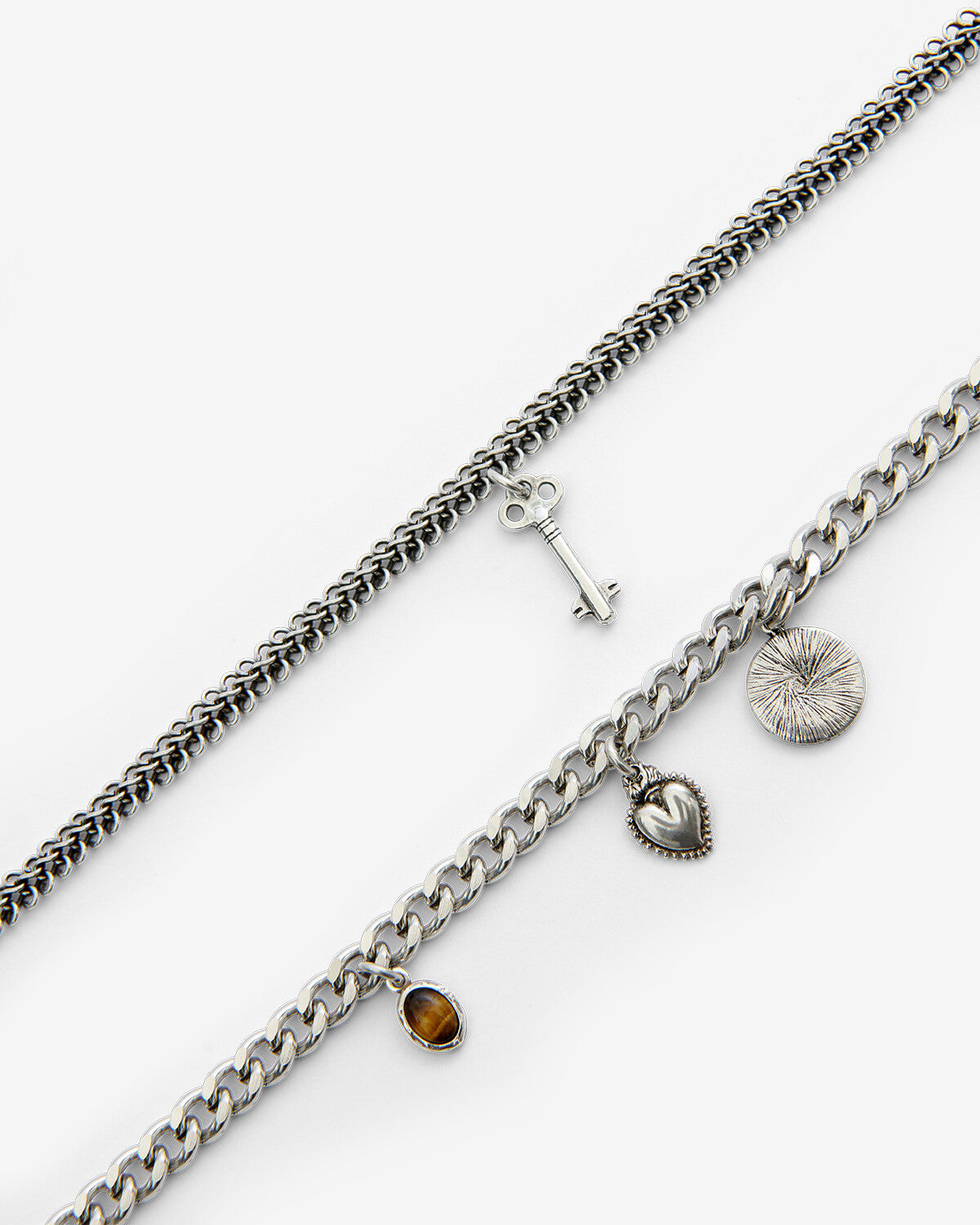 Colgantes en forma de llave, diente, corazón, medalla, piedra y anillo retorcido