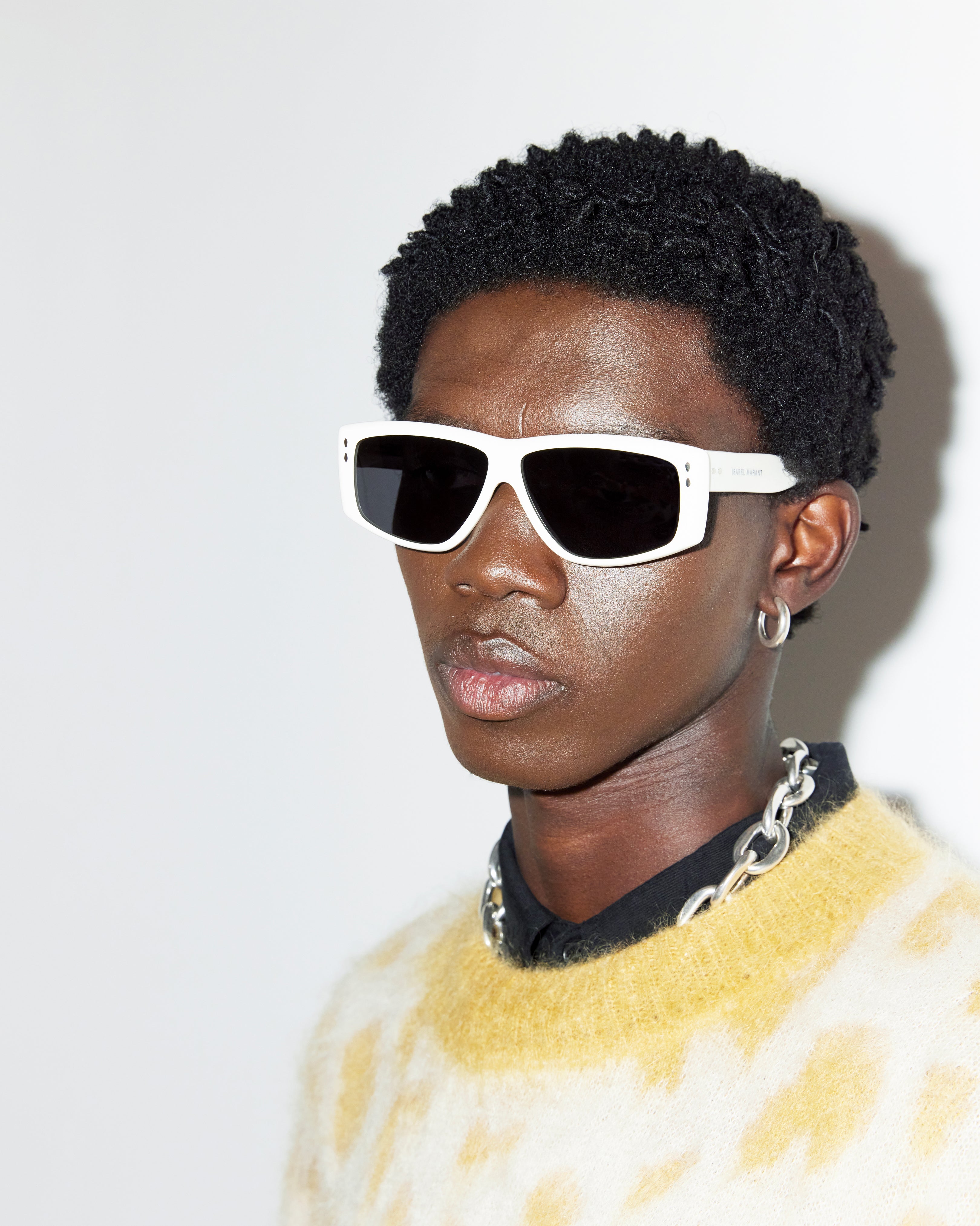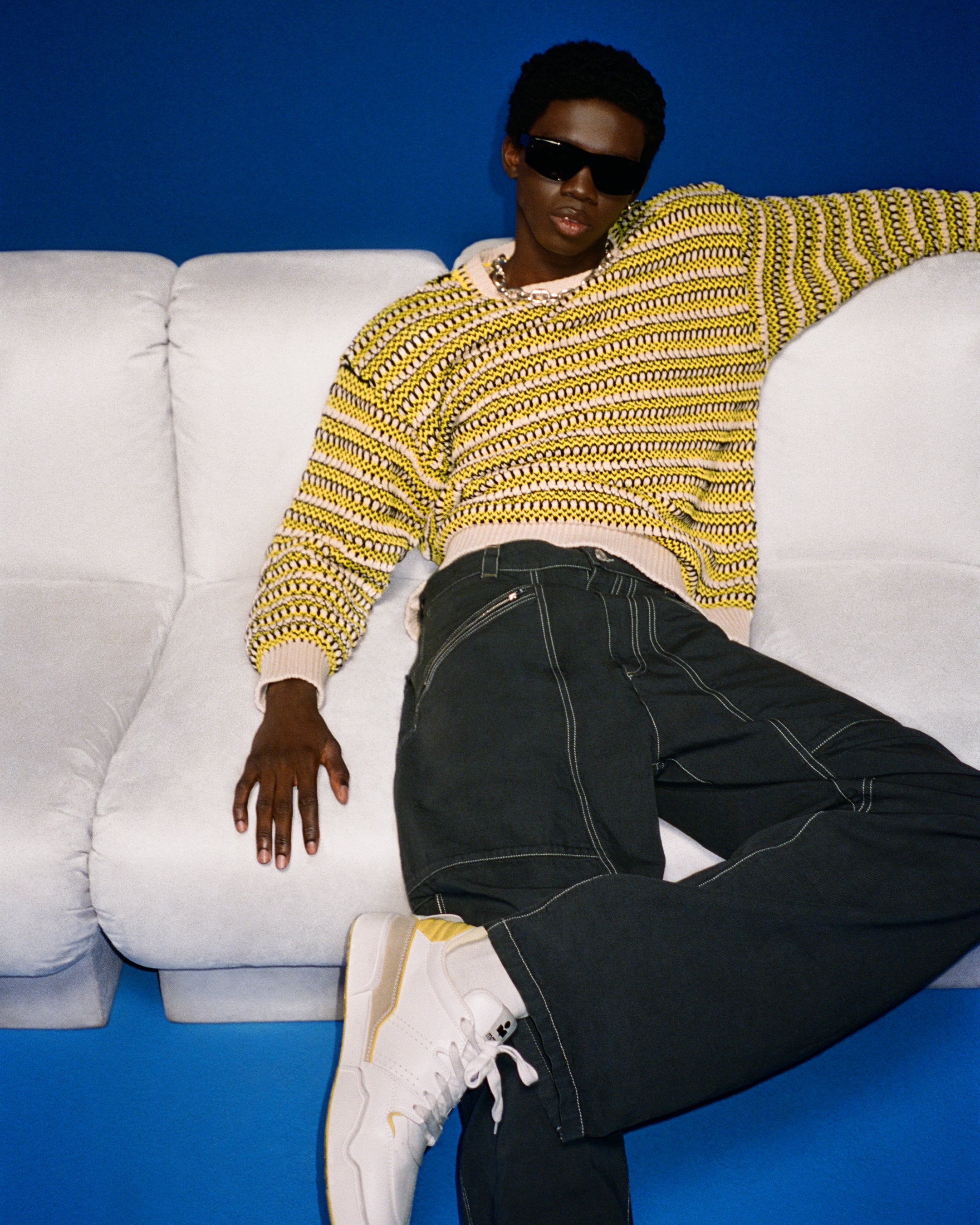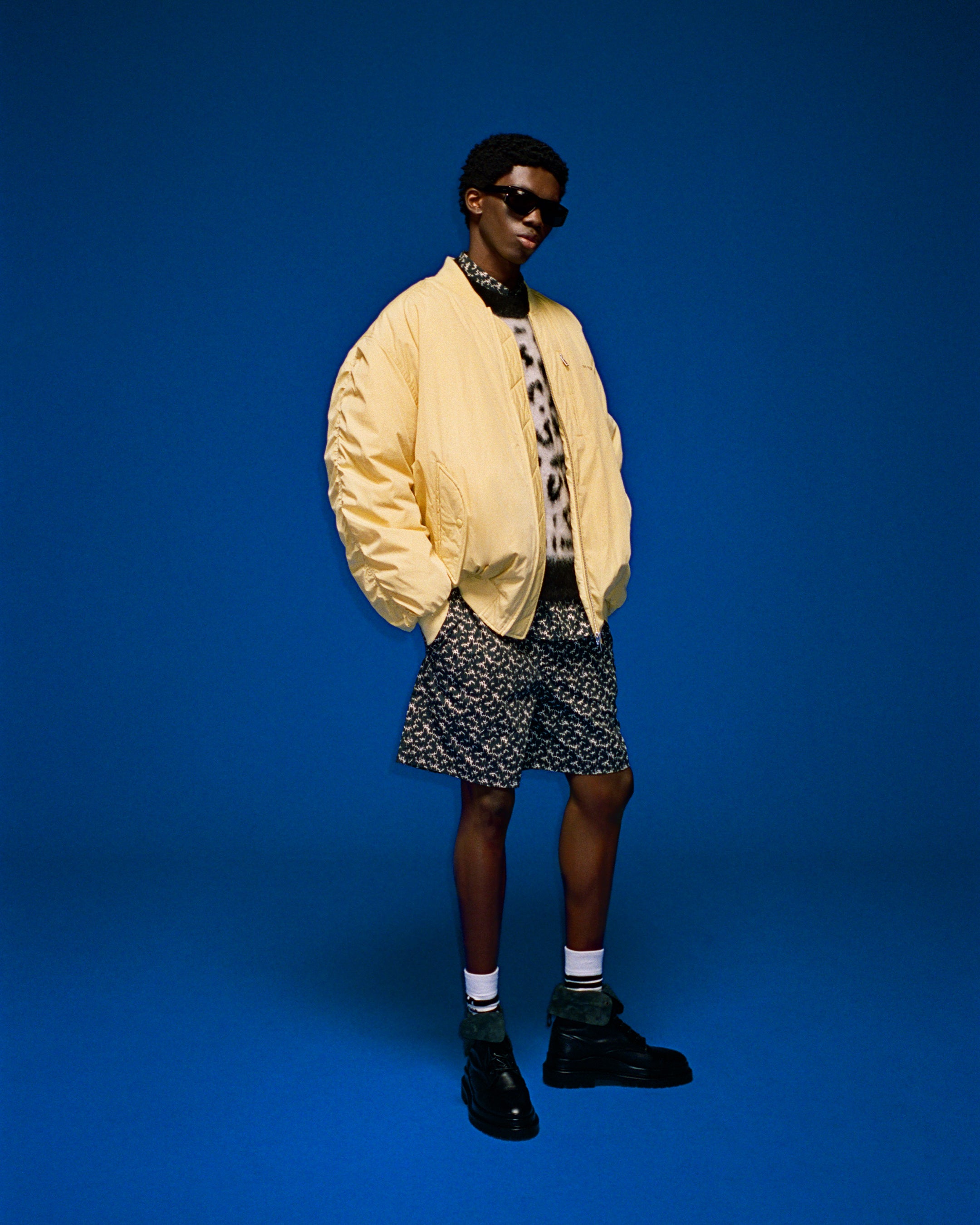 Les motifs graphiques se joignent aux imprimés organiques. Tout dans cette silhouette est une question de clash et d’oppositions. Le noir et blanc se pimente de touches de jaune.