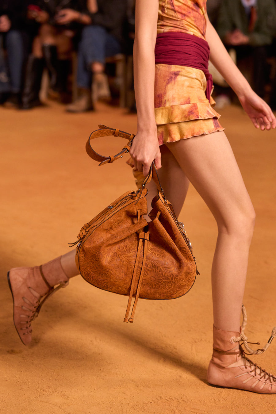 Cette saison, partie à la recherche du soleil, elle voyage seule. La collection porte la patine de son trajet : jerseys et soies lavés, cuirs embossés et brûlés par la chaleur. De fines broderies totémiques, des rangées de perles au bout des franges ou l’empreinte d’écorces sur les bijoux précisent que