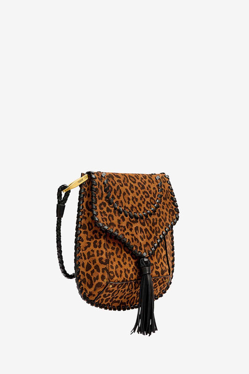 編み込みスエード&ヒョウ柄プリント入りレザー製 ショルダーバッグ