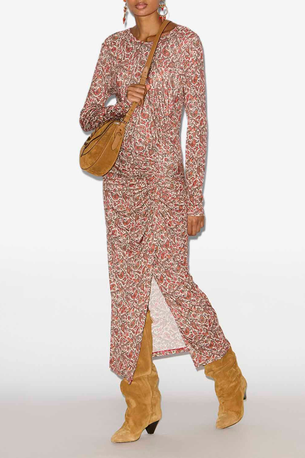 タペストリー柄プリント&ドレープ入りジャージー製 ロングドレス
