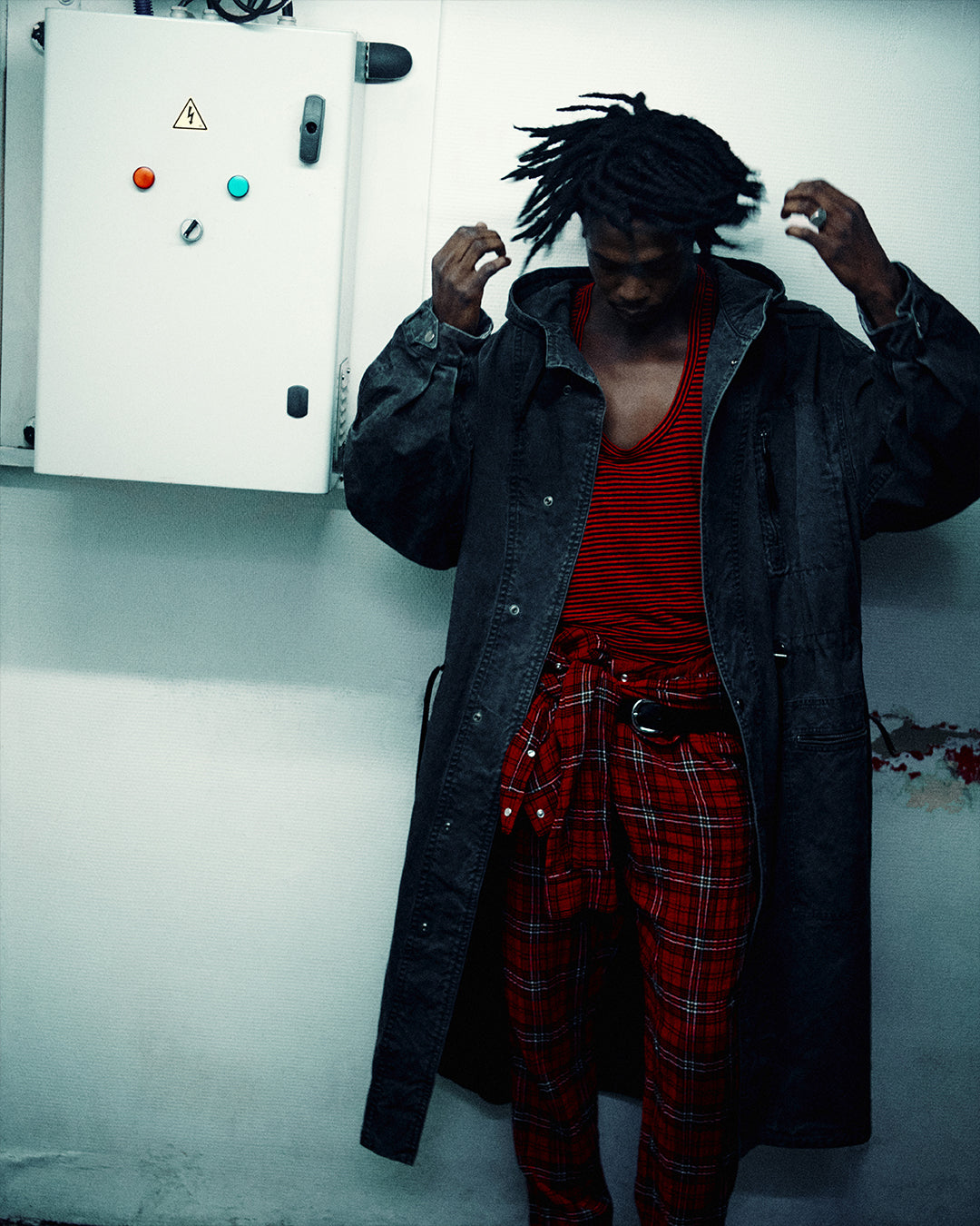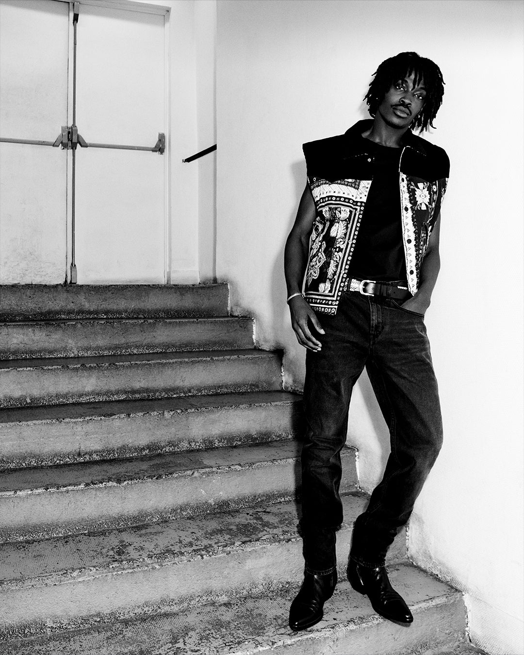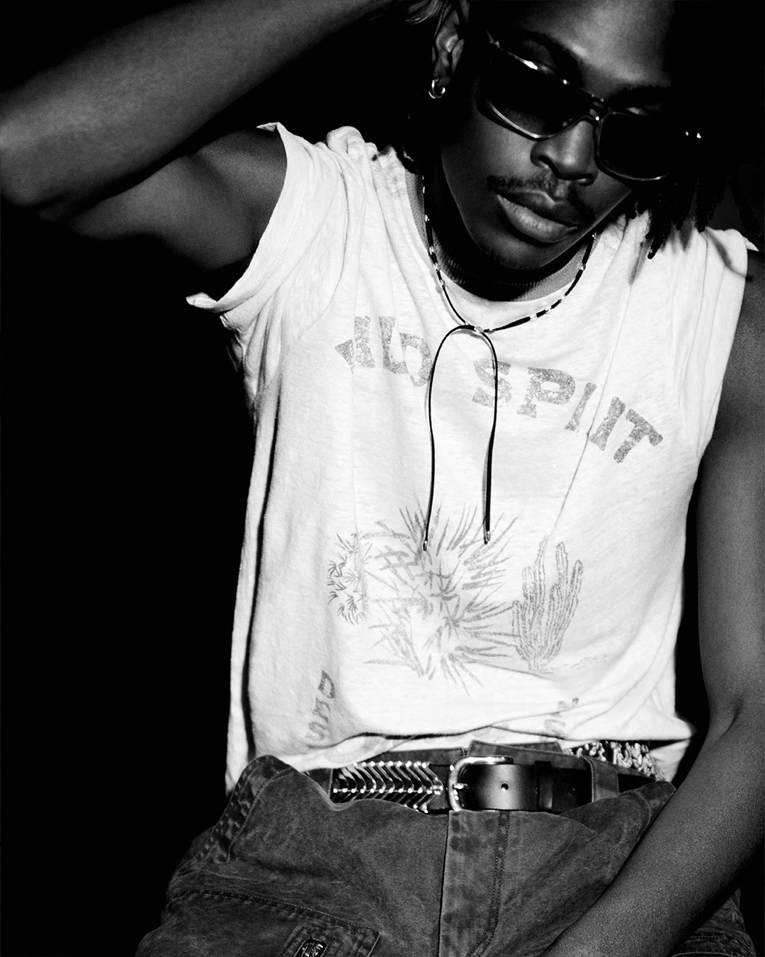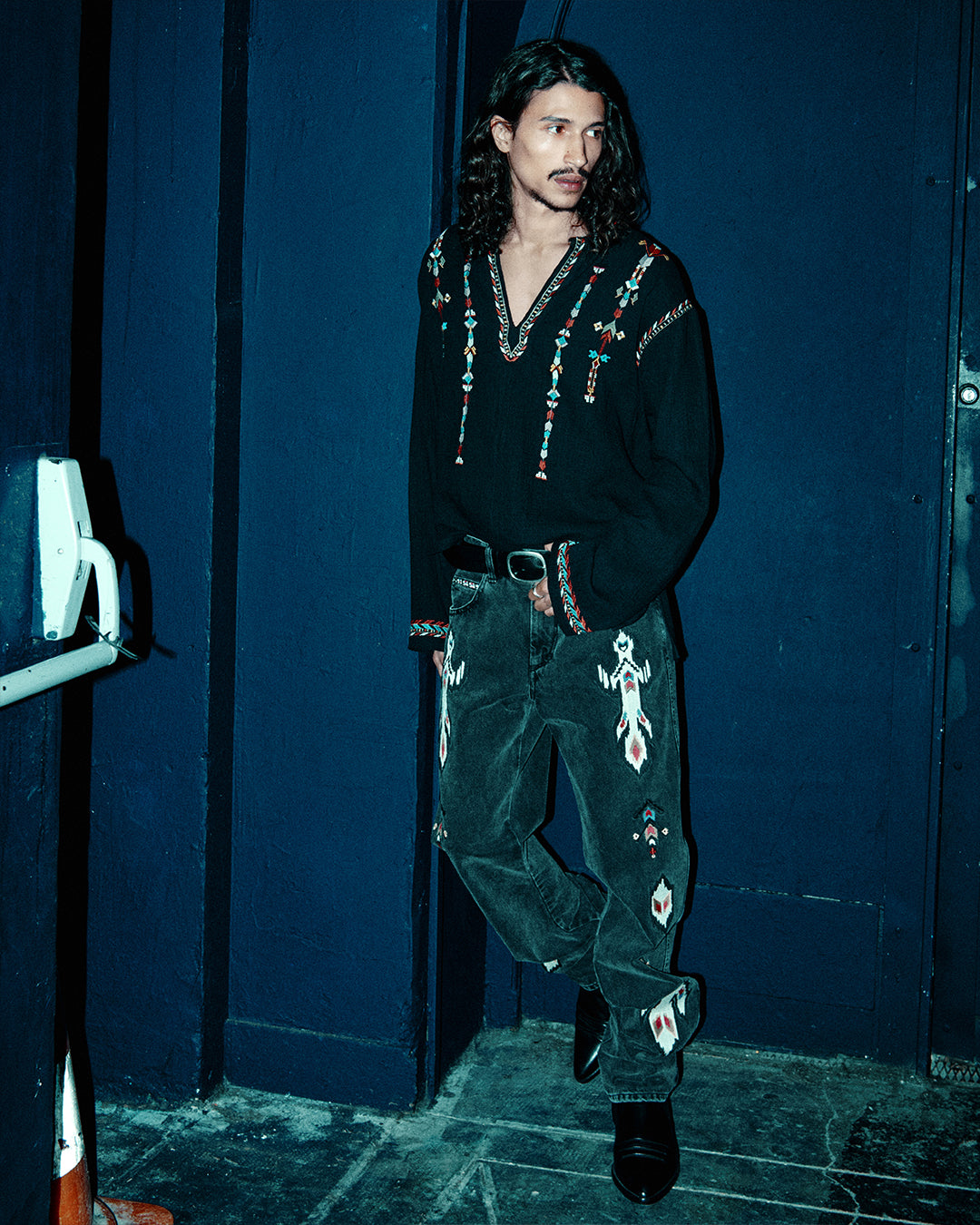 パーティーマークの壁のあるクラブで、イザベル・マランの男はよりセクシーな姿勢を主張する。フォークスタイルのシャツは胴が開き、赤と黒のストライプのスラッシュタンクトップは黒のレザーパンツに合わせる。ペイズリースタイルのフローラルプリントが登場すると、ロマンティシズムを帯びたロックのワードローブのビジョンが浮かび上がる。旅先から持ち帰ったと思われるジーンズ、ジャケット、スカーフには、グラフィック・ジャカード、ナチュラル・カラー、ウォッシュ加工された素材がミックスされている。イカット柄のニットはひとつの旅の証しであり、デニムに施された技巧的な刺繍は、東洋と西洋、ストリートとアンダーグラウンドの間のもうひとつの旅を物語っている。